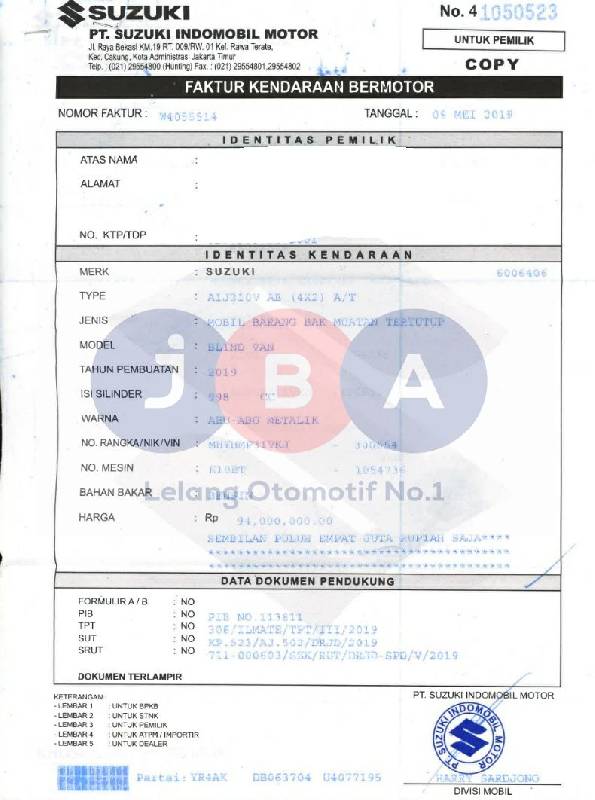 - Kondisi objek lelang dilelang apa adanya, baik kondisi fisik, mesin maupun legalitas kendaraan. Jika terdapat kekurangan/cacat baik yang terlihat maupun yang tidak terlihat, maka semua akan menjadi tanggung jawab/risiko Pemenang Lelang. Oleh karena itu, Pemenang Lelang melepaskan segala hak untuk menuntut dan/atau meminta ganti rugi atas hal tersebut kepada JBA.