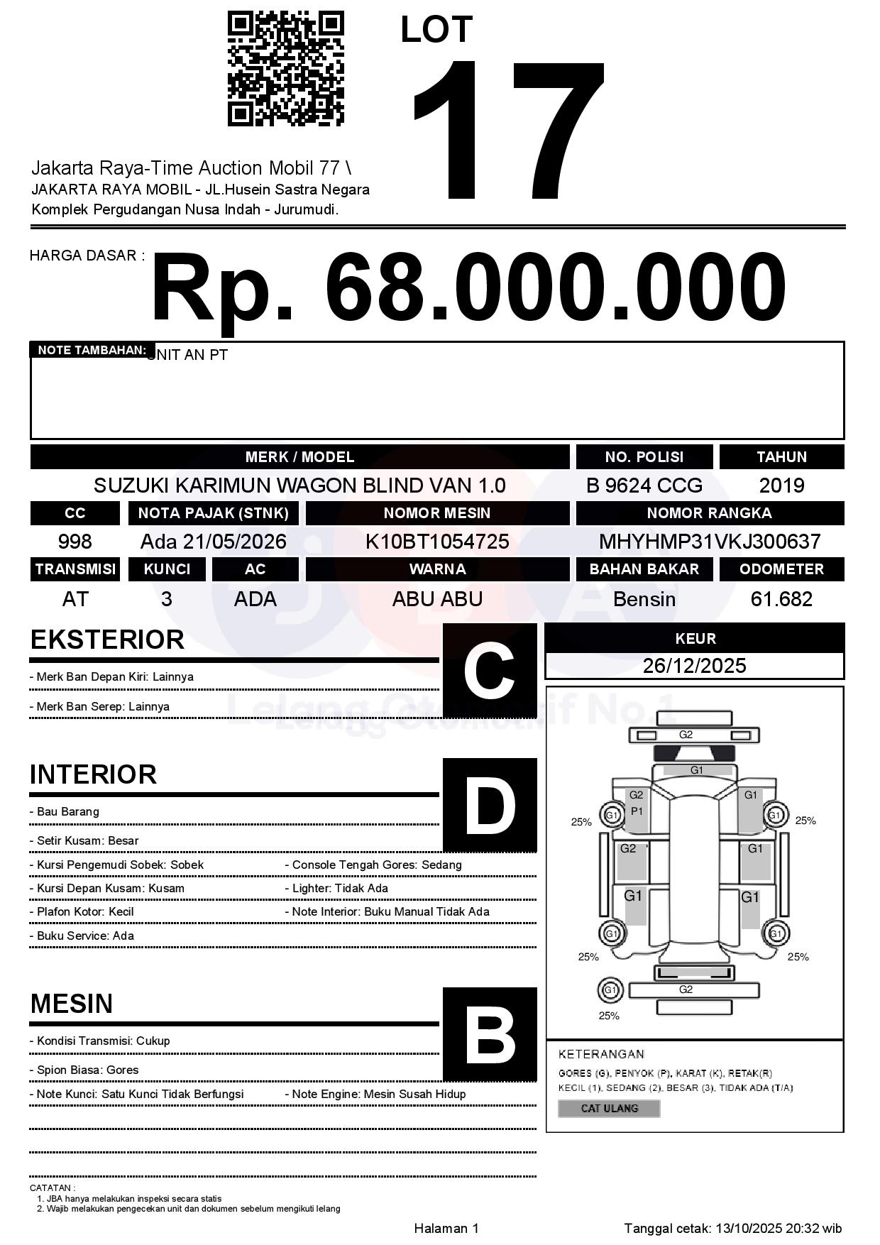 - Kondisi objek lelang dilelang apa adanya, baik kondisi fisik, mesin maupun legalitas kendaraan. Jika terdapat kekurangan/cacat baik yang terlihat maupun yang tidak terlihat, maka semua akan menjadi tanggung jawab/risiko Pemenang Lelang. Oleh karena itu, Pemenang Lelang melepaskan segala hak untuk menuntut dan/atau meminta ganti rugi atas hal tersebut kepada JBA.