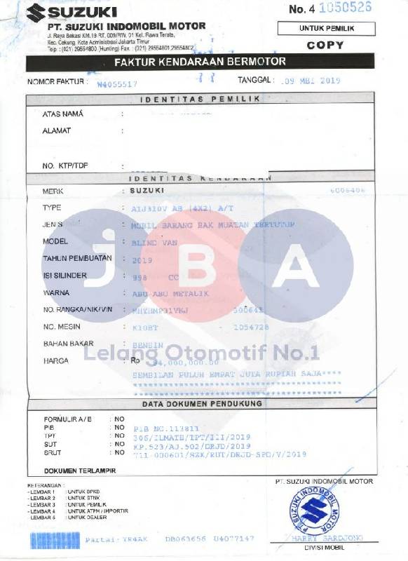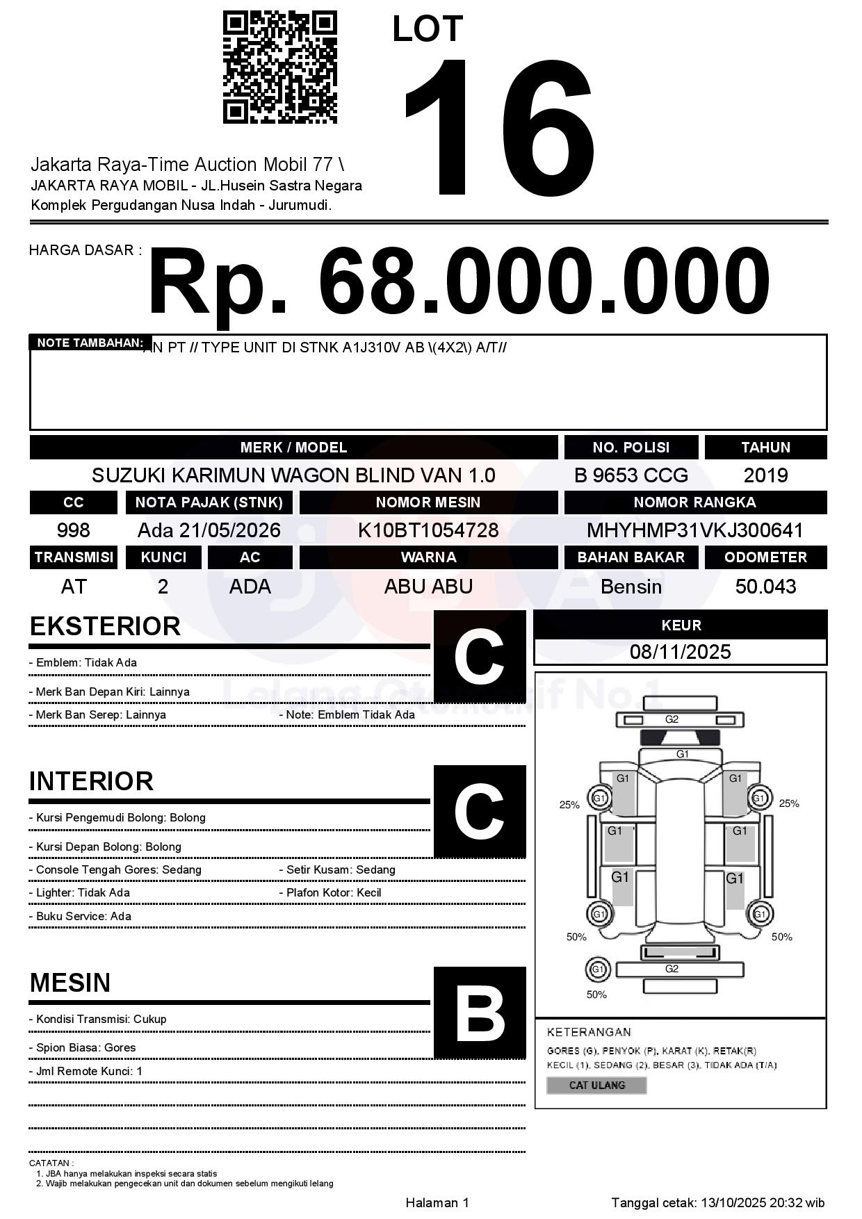 - Kondisi objek lelang dilelang apa adanya, baik kondisi fisik, mesin maupun legalitas kendaraan. Jika terdapat kekurangan/cacat baik yang terlihat maupun yang tidak terlihat, maka semua akan menjadi tanggung jawab/risiko Pemenang Lelang. Oleh karena itu, Pemenang Lelang melepaskan segala hak untuk menuntut dan/atau meminta ganti rugi atas hal tersebut kepada JBA.