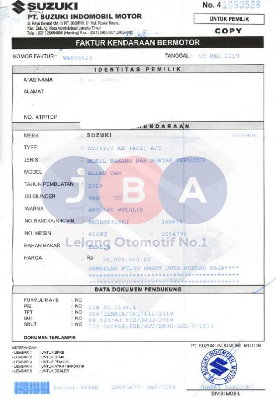 - Kondisi objek lelang dilelang apa adanya, baik kondisi fisik, mesin maupun legalitas kendaraan. Jika terdapat kekurangan/cacat baik yang terlihat maupun yang tidak terlihat, maka semua akan menjadi tanggung jawab/risiko Pemenang Lelang. Oleh karena itu, Pemenang Lelang melepaskan segala hak untuk menuntut dan/atau meminta ganti rugi atas hal tersebut kepada JBA.