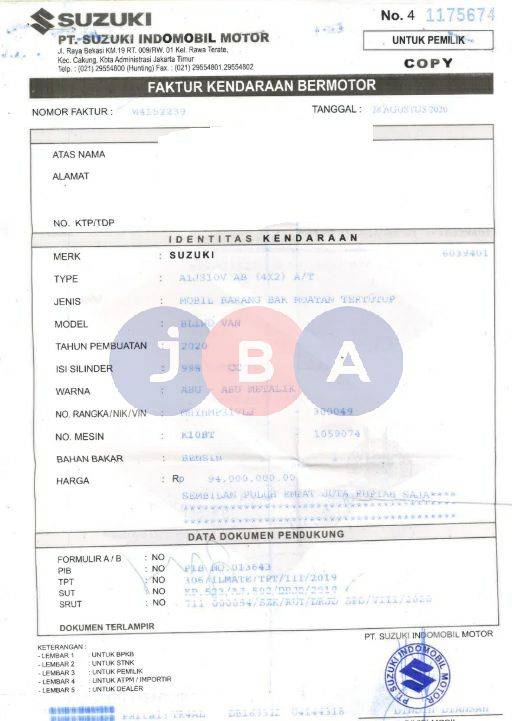 - Kondisi objek lelang dilelang apa adanya, baik kondisi fisik, mesin maupun legalitas kendaraan. Jika terdapat kekurangan/cacat baik yang terlihat maupun yang tidak terlihat, maka semua akan menjadi tanggung jawab/risiko Pemenang Lelang. Oleh karena itu, Pemenang Lelang melepaskan segala hak untuk menuntut dan/atau meminta ganti rugi atas hal tersebut kepada JBA.