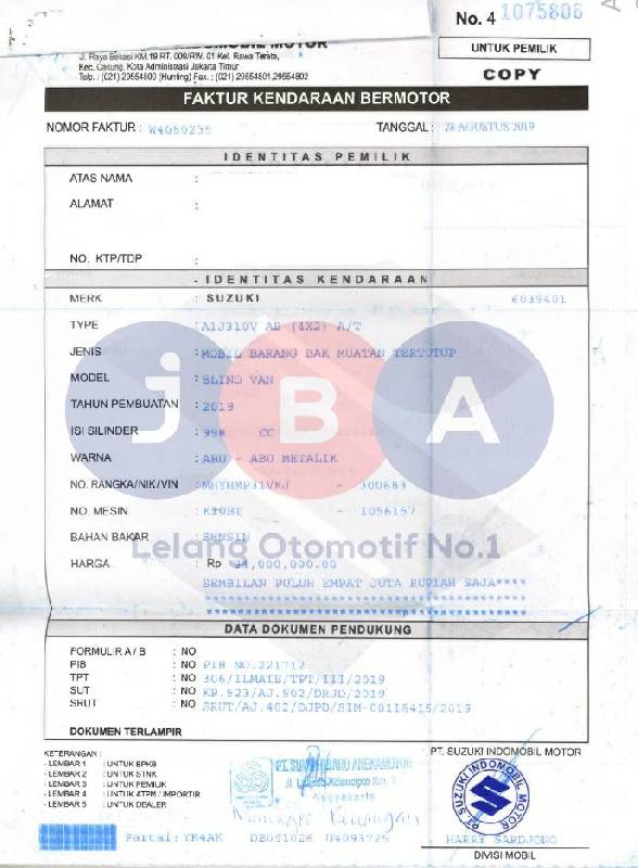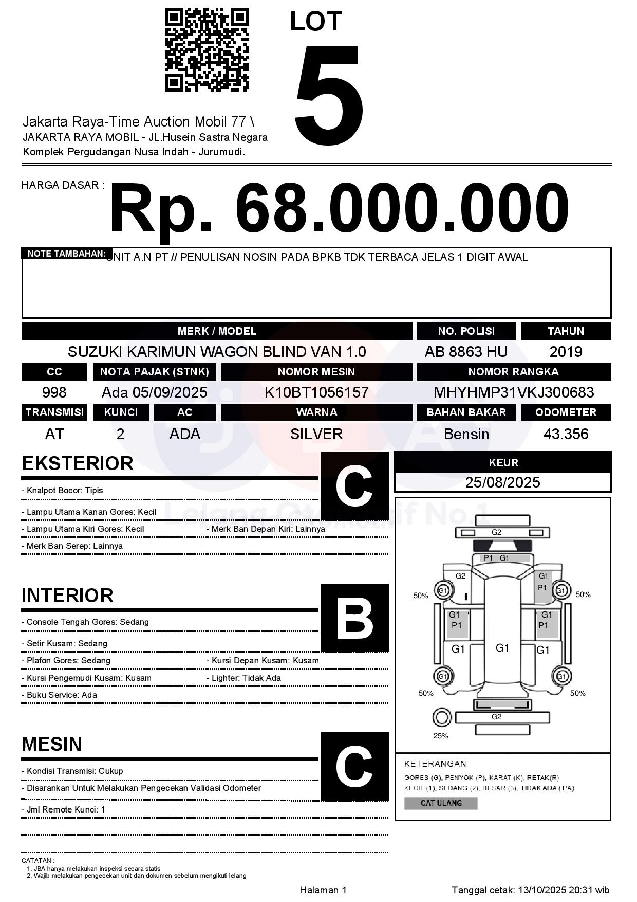 - Kondisi objek lelang dilelang apa adanya, baik kondisi fisik, mesin maupun legalitas kendaraan. Jika terdapat kekurangan/cacat baik yang terlihat maupun yang tidak terlihat, maka semua akan menjadi tanggung jawab/risiko Pemenang Lelang. Oleh karena itu, Pemenang Lelang melepaskan segala hak untuk menuntut dan/atau meminta ganti rugi atas hal tersebut kepada JBA.