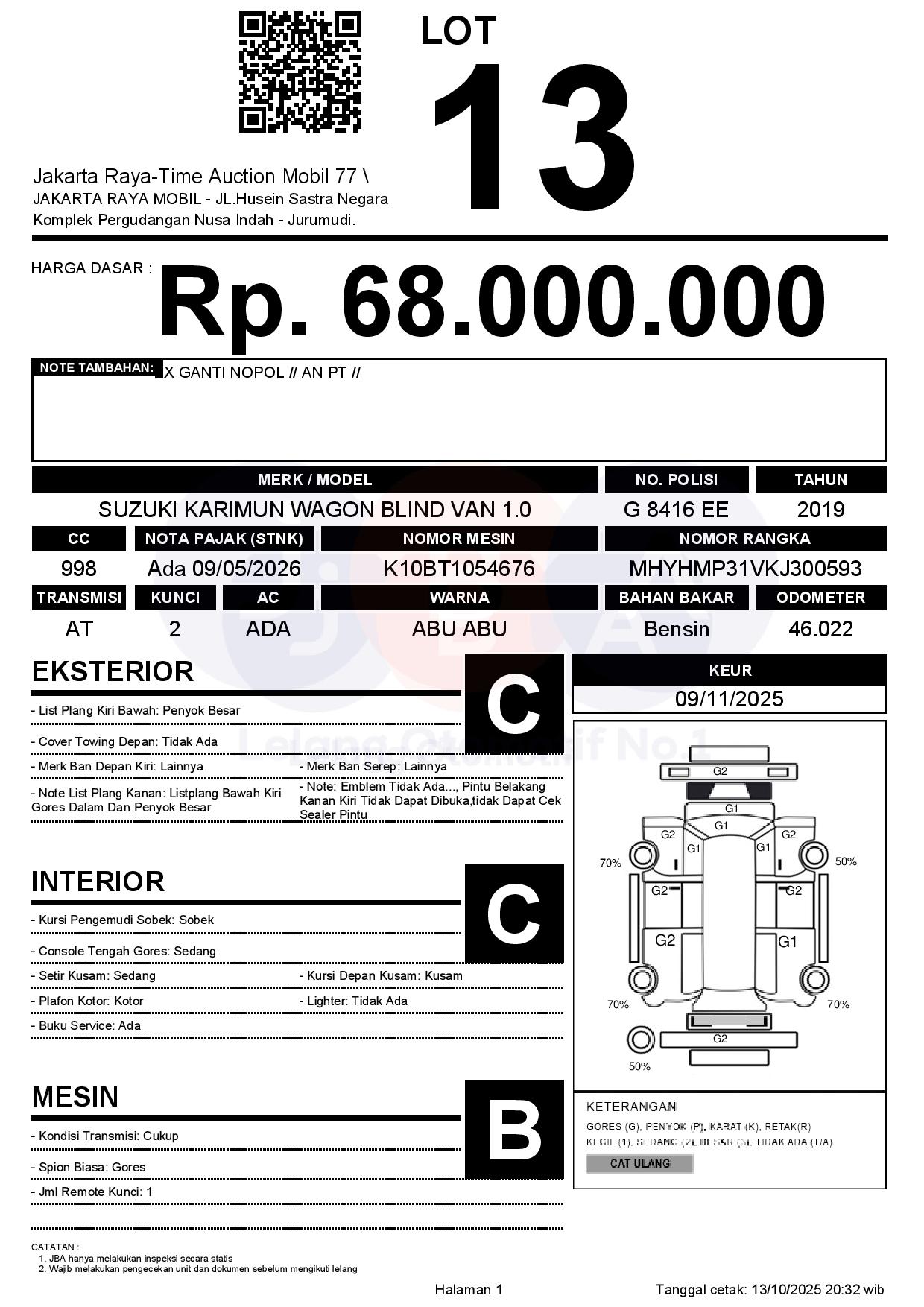 - Kondisi objek lelang dilelang apa adanya, baik kondisi fisik, mesin maupun legalitas kendaraan. Jika terdapat kekurangan/cacat baik yang terlihat maupun yang tidak terlihat, maka semua akan menjadi tanggung jawab/risiko Pemenang Lelang. Oleh karena itu, Pemenang Lelang melepaskan segala hak untuk menuntut dan/atau meminta ganti rugi atas hal tersebut kepada JBA.