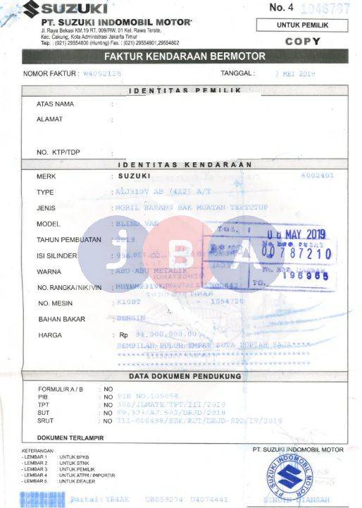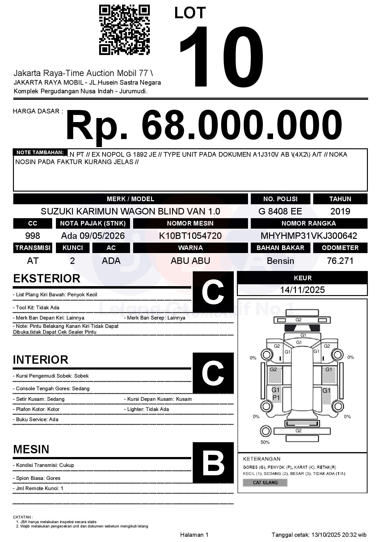 - Kondisi objek lelang dilelang apa adanya, baik kondisi fisik, mesin maupun legalitas kendaraan. Jika terdapat kekurangan/cacat baik yang terlihat maupun yang tidak terlihat, maka semua akan menjadi tanggung jawab/risiko Pemenang Lelang. Oleh karena itu, Pemenang Lelang melepaskan segala hak untuk menuntut dan/atau meminta ganti rugi atas hal tersebut kepada JBA.