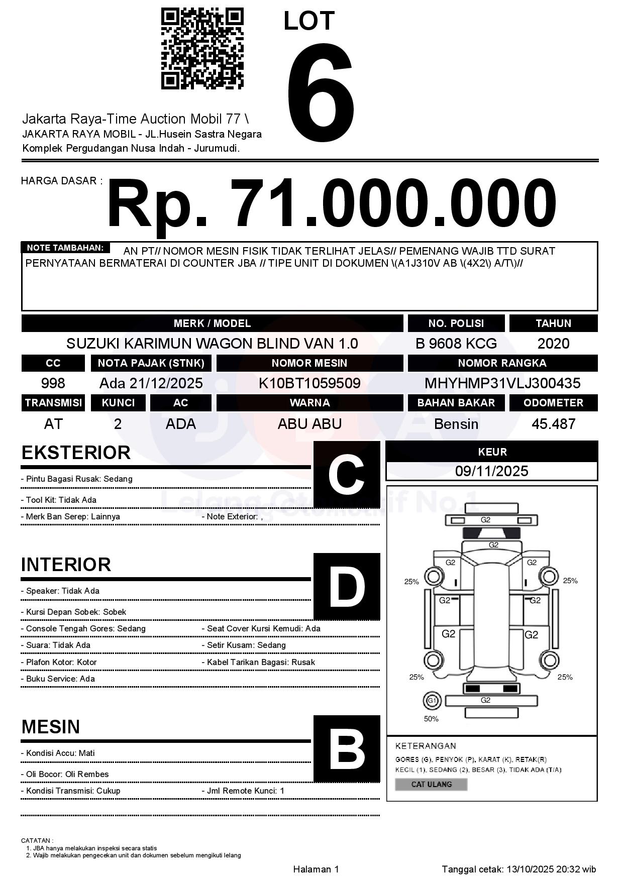 - Kondisi objek lelang dilelang apa adanya, baik kondisi fisik, mesin maupun legalitas kendaraan. Jika terdapat kekurangan/cacat baik yang terlihat maupun yang tidak terlihat, maka semua akan menjadi tanggung jawab/risiko Pemenang Lelang. Oleh karena itu, Pemenang Lelang melepaskan segala hak untuk menuntut dan/atau meminta ganti rugi atas hal tersebut kepada JBA.