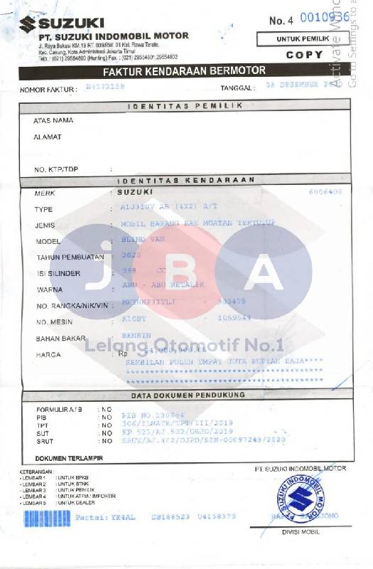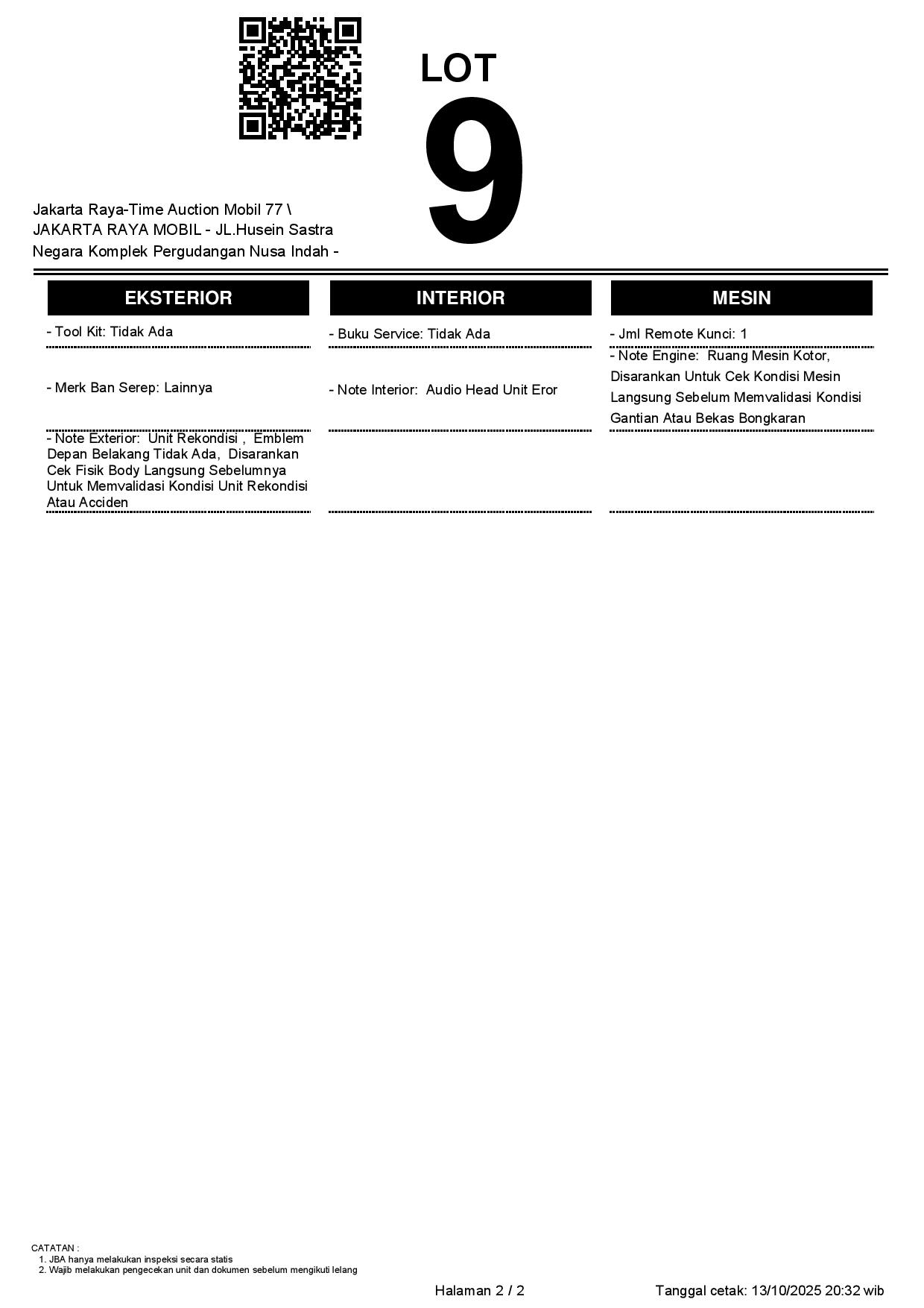 - Kondisi objek lelang dilelang apa adanya, baik kondisi fisik, mesin maupun legalitas kendaraan. Jika terdapat kekurangan/cacat baik yang terlihat maupun yang tidak terlihat, maka semua akan menjadi tanggung jawab/risiko Pemenang Lelang. Oleh karena itu, Pemenang Lelang melepaskan segala hak untuk menuntut dan/atau meminta ganti rugi atas hal tersebut kepada JBA.