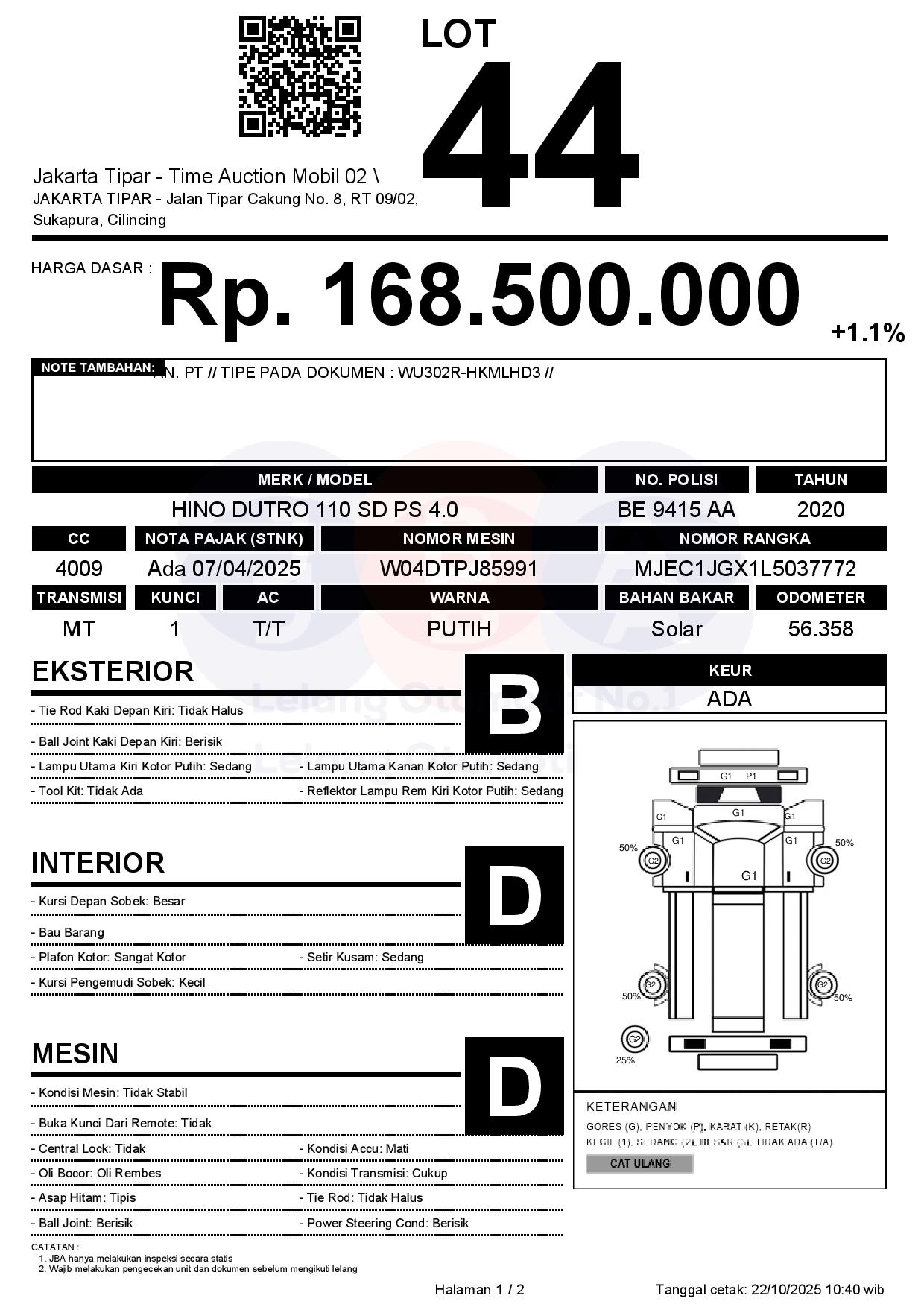 - Kondisi objek lelang dilelang apa adanya, baik kondisi fisik, mesin maupun legalitas kendaraan. Jika terdapat kekurangan/cacat baik yang terlihat maupun yang tidak terlihat, maka semua akan menjadi tanggung jawab/risiko Pemenang Lelang. Oleh karena itu, Pemenang Lelang melepaskan segala hak untuk menuntut dan/atau meminta ganti rugi atas hal tersebut kepada JBA.