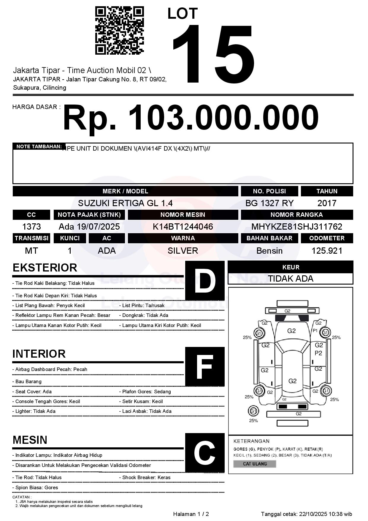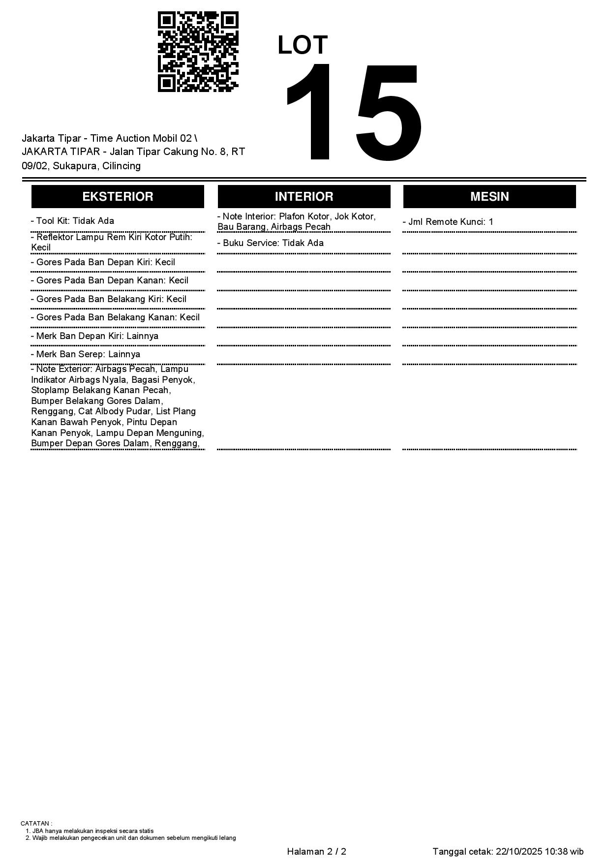 - Kondisi objek lelang dilelang apa adanya, baik kondisi fisik, mesin maupun legalitas kendaraan. Jika terdapat kekurangan/cacat baik yang terlihat maupun yang tidak terlihat, maka semua akan menjadi tanggung jawab/risiko Pemenang Lelang. Oleh karena itu, Pemenang Lelang melepaskan segala hak untuk menuntut dan/atau meminta ganti rugi atas hal tersebut kepada JBA.