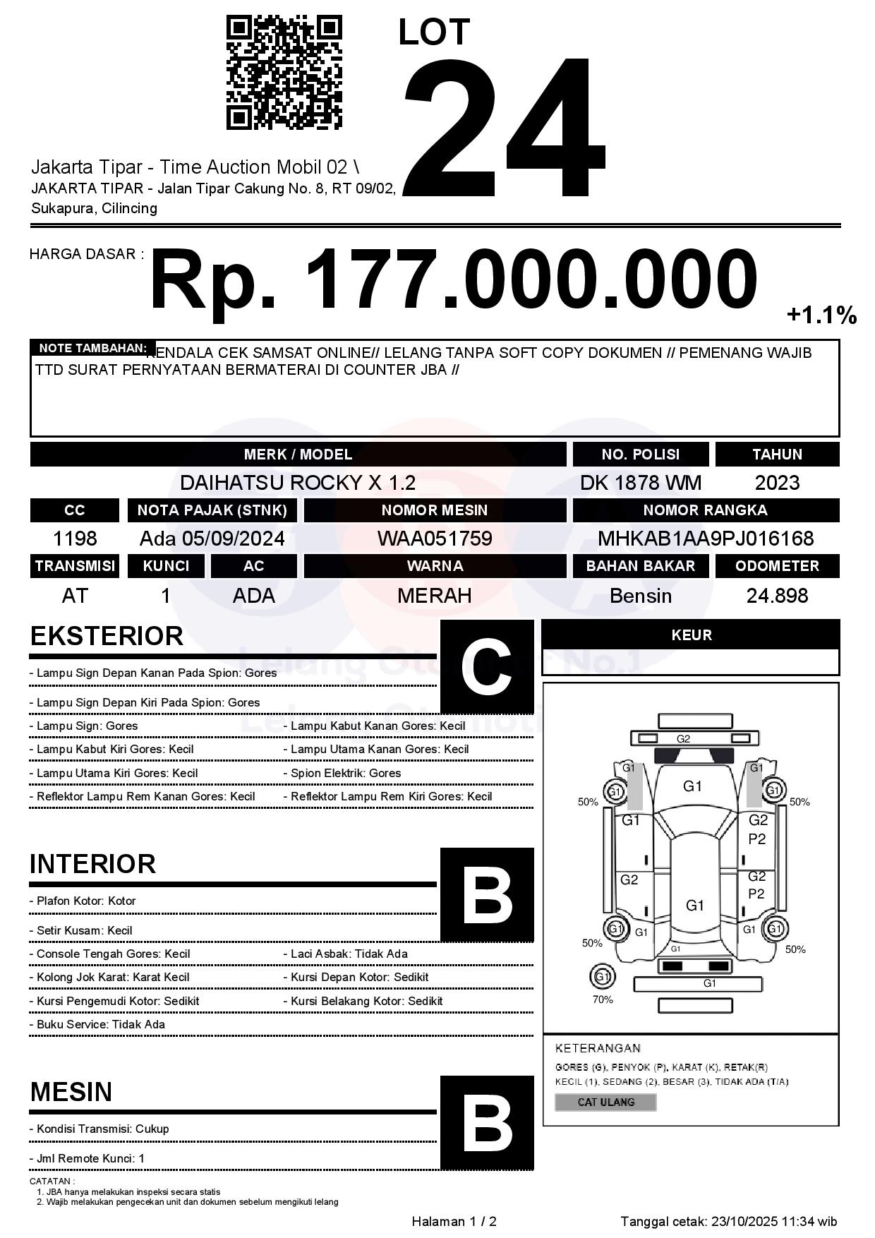- Kondisi objek lelang dilelang apa adanya, baik kondisi fisik, mesin maupun legalitas kendaraan. Jika terdapat kekurangan/cacat baik yang terlihat maupun yang tidak terlihat, maka semua akan menjadi tanggung jawab/risiko Pemenang Lelang. Oleh karena itu, Pemenang Lelang melepaskan segala hak untuk menuntut dan/atau meminta ganti rugi atas hal tersebut kepada JBA.