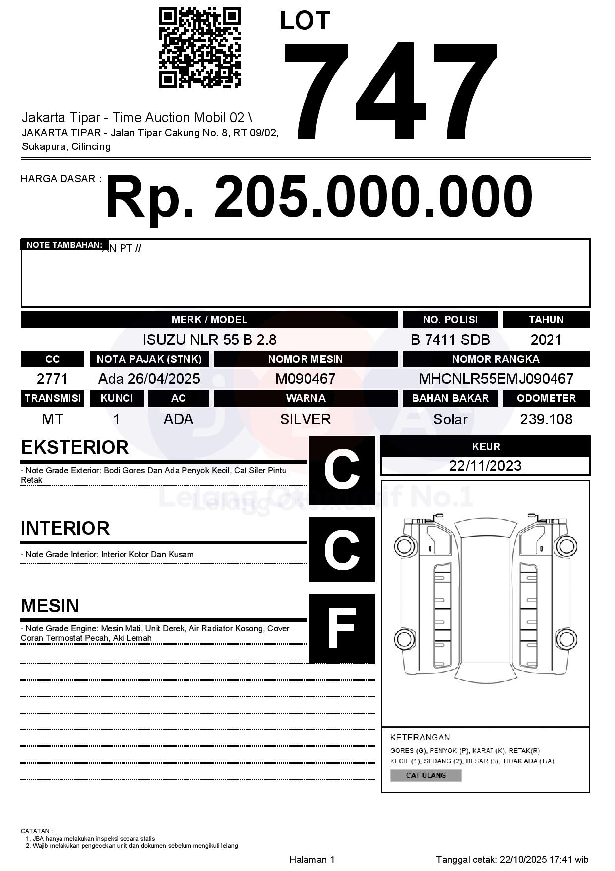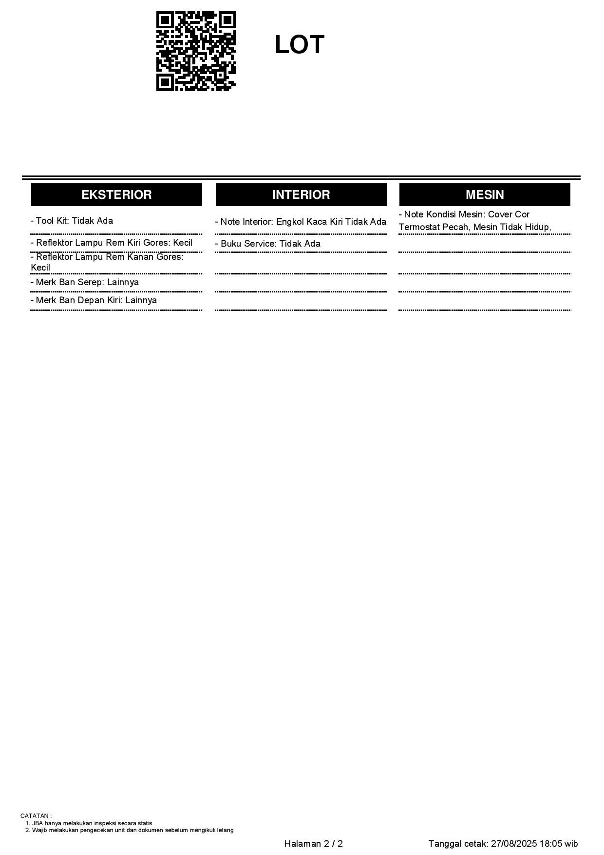 - Kondisi objek lelang dilelang apa adanya, baik kondisi fisik, mesin maupun legalitas kendaraan. Jika terdapat kekurangan/cacat baik yang terlihat maupun yang tidak terlihat, maka semua akan menjadi tanggung jawab/risiko Pemenang Lelang. Oleh karena itu, Pemenang Lelang melepaskan segala hak untuk menuntut dan/atau meminta ganti rugi atas hal tersebut kepada JBA.