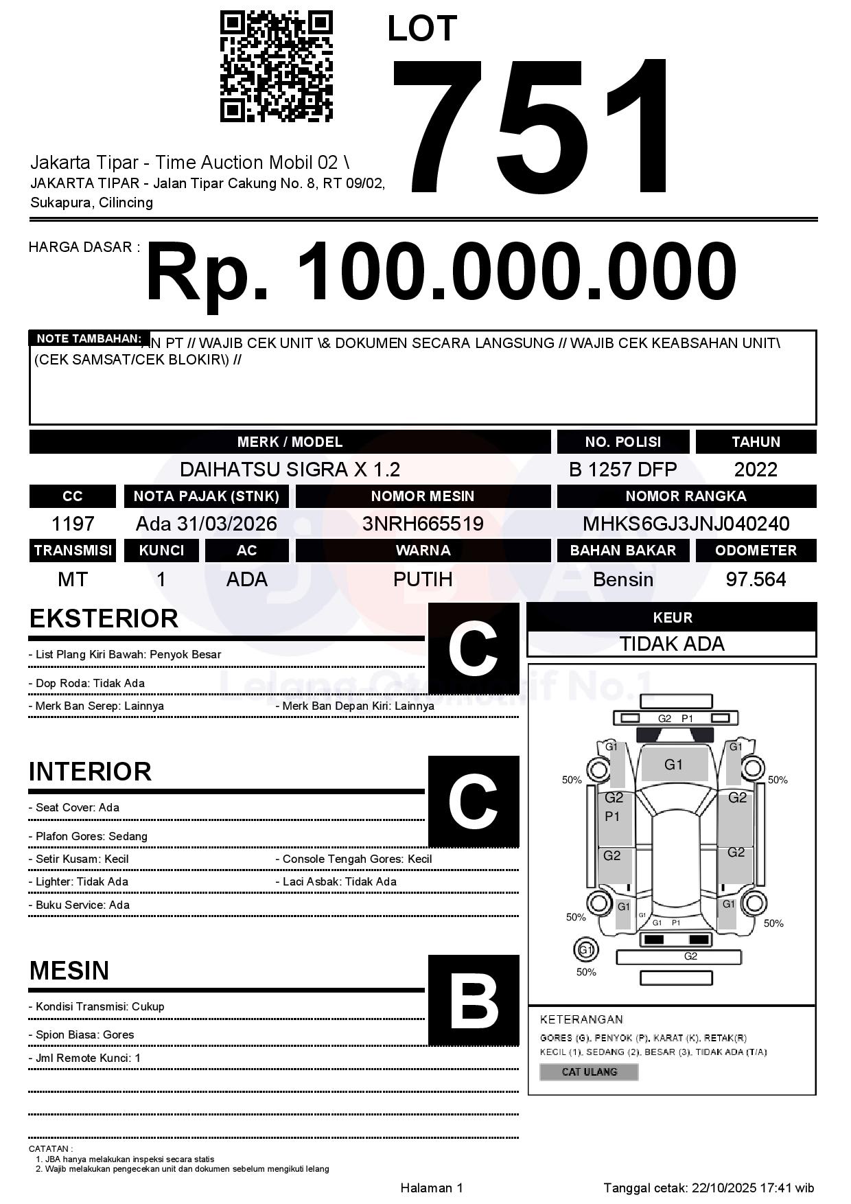 - Kondisi objek lelang dilelang apa adanya, baik kondisi fisik, mesin maupun legalitas kendaraan. Jika terdapat kekurangan/cacat baik yang terlihat maupun yang tidak terlihat, maka semua akan menjadi tanggung jawab/risiko Pemenang Lelang. Oleh karena itu, Pemenang Lelang melepaskan segala hak untuk menuntut dan/atau meminta ganti rugi atas hal tersebut kepada JBA.