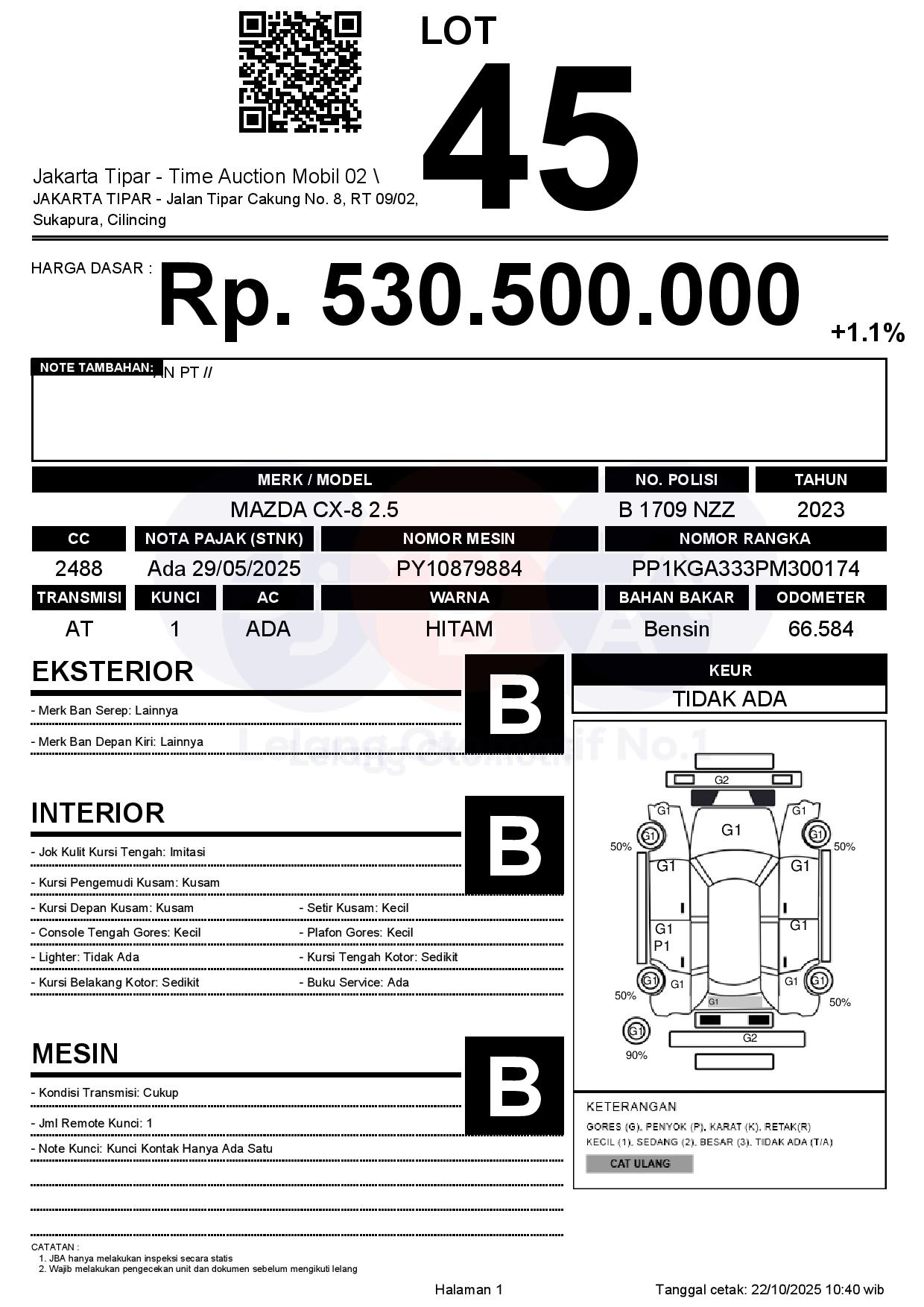 - Kondisi objek lelang dilelang apa adanya, baik kondisi fisik, mesin maupun legalitas kendaraan. Jika terdapat kekurangan/cacat baik yang terlihat maupun yang tidak terlihat, maka semua akan menjadi tanggung jawab/risiko Pemenang Lelang. Oleh karena itu, Pemenang Lelang melepaskan segala hak untuk menuntut dan/atau meminta ganti rugi atas hal tersebut kepada JBA.