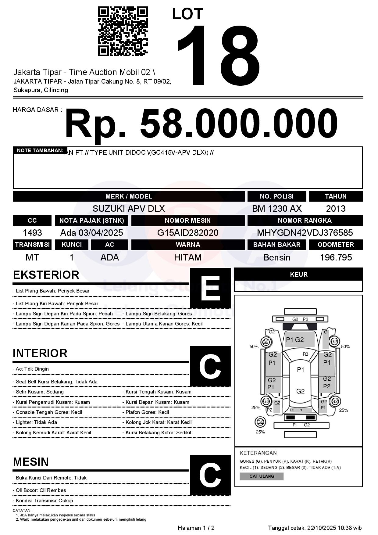 - Kondisi objek lelang dilelang apa adanya, baik kondisi fisik, mesin maupun legalitas kendaraan. Jika terdapat kekurangan/cacat baik yang terlihat maupun yang tidak terlihat, maka semua akan menjadi tanggung jawab/risiko Pemenang Lelang. Oleh karena itu, Pemenang Lelang melepaskan segala hak untuk menuntut dan/atau meminta ganti rugi atas hal tersebut kepada JBA.