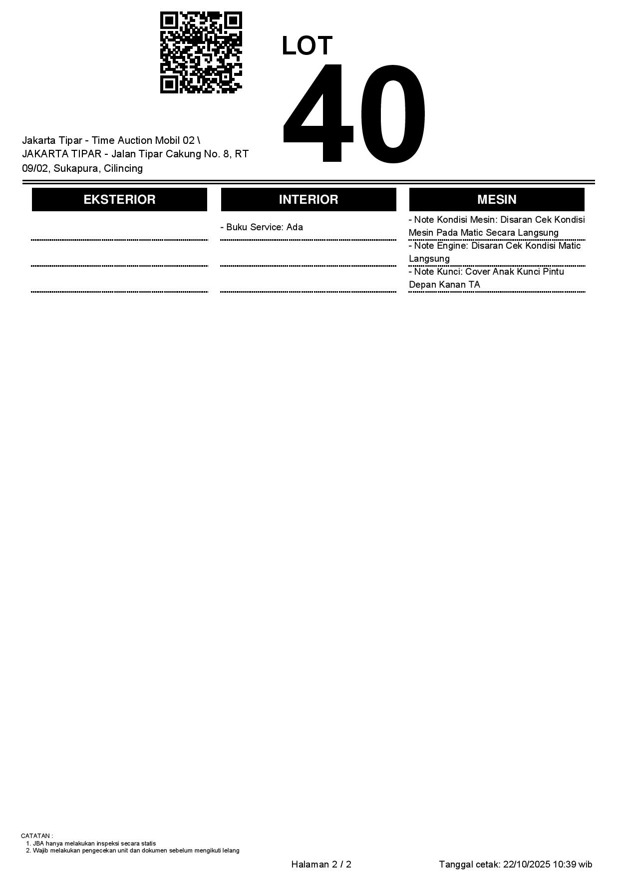 - Kondisi objek lelang dilelang apa adanya, baik kondisi fisik, mesin maupun legalitas kendaraan. Jika terdapat kekurangan/cacat baik yang terlihat maupun yang tidak terlihat, maka semua akan menjadi tanggung jawab/risiko Pemenang Lelang. Oleh karena itu, Pemenang Lelang melepaskan segala hak untuk menuntut dan/atau meminta ganti rugi atas hal tersebut kepada JBA.