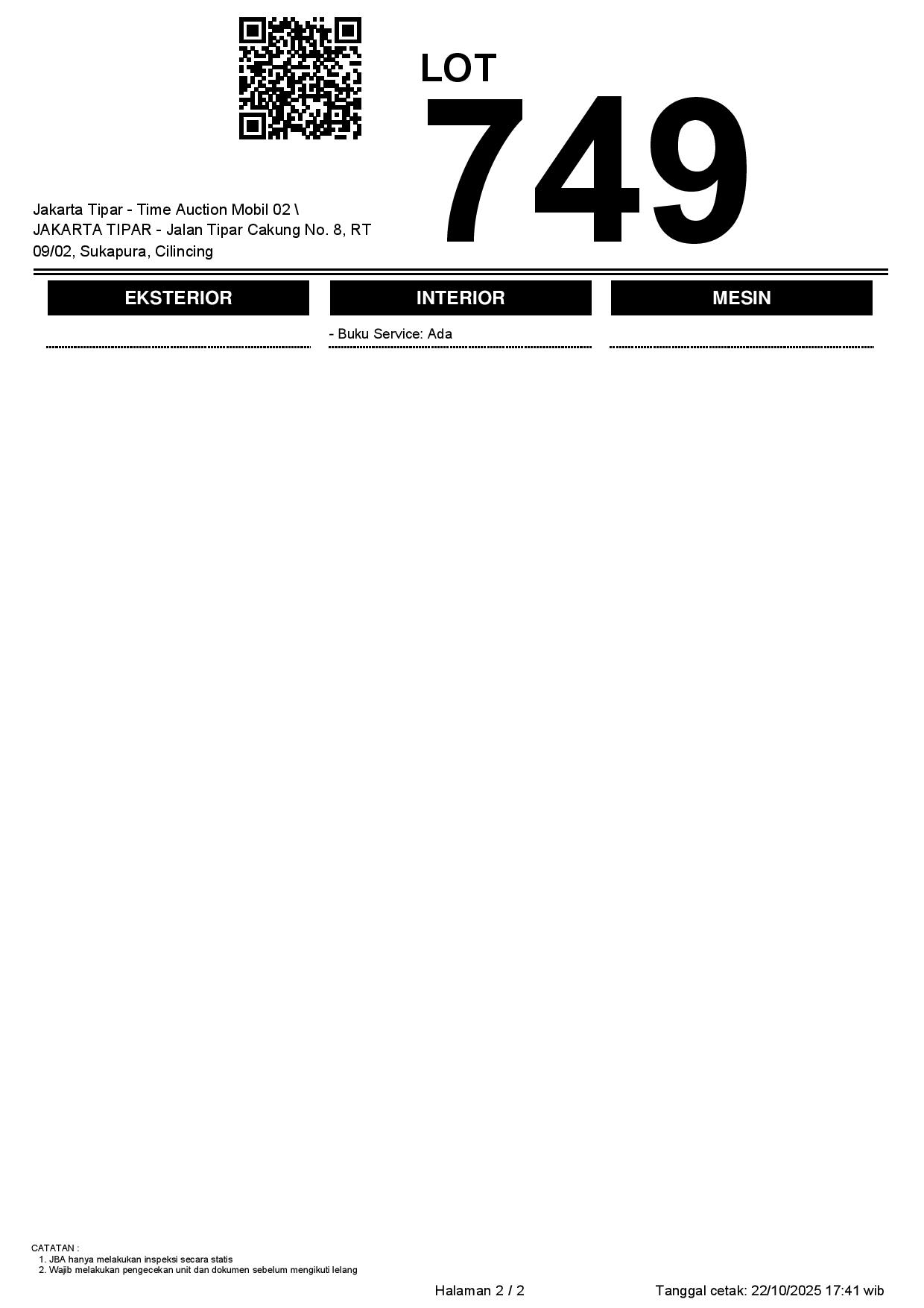 - Kondisi objek lelang dilelang apa adanya, baik kondisi fisik, mesin maupun legalitas kendaraan. Jika terdapat kekurangan/cacat baik yang terlihat maupun yang tidak terlihat, maka semua akan menjadi tanggung jawab/risiko Pemenang Lelang. Oleh karena itu, Pemenang Lelang melepaskan segala hak untuk menuntut dan/atau meminta ganti rugi atas hal tersebut kepada JBA.