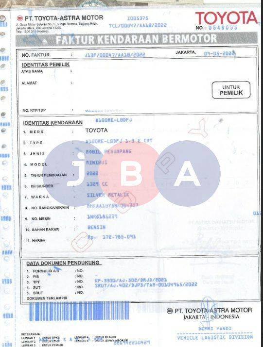 - Dokumen kepemilikan akan diserahkan kepada Pemenang Lelang sesuai dengan jadwal yang tercantum dalam katalog objek lelang, dan Berita Acara Pemenang Lelang (BAPL) akan diberikan oleh JBA kepada Pemenang Lelang setelah pembayaran harga terbentuk atau pada saat pengambilan unit objek lelang.