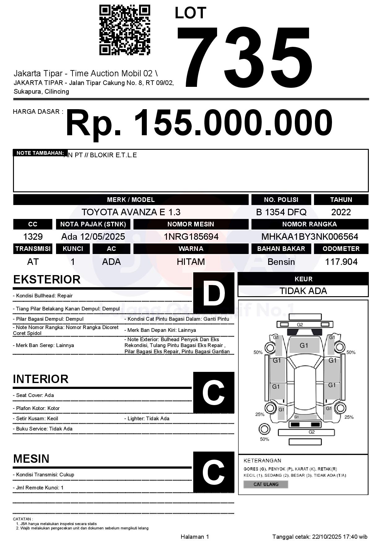 - Kondisi objek lelang dilelang apa adanya, baik kondisi fisik, mesin maupun legalitas kendaraan. Jika terdapat kekurangan/cacat baik yang terlihat maupun yang tidak terlihat, maka semua akan menjadi tanggung jawab/risiko Pemenang Lelang. Oleh karena itu, Pemenang Lelang melepaskan segala hak untuk menuntut dan/atau meminta ganti rugi atas hal tersebut kepada JBA.