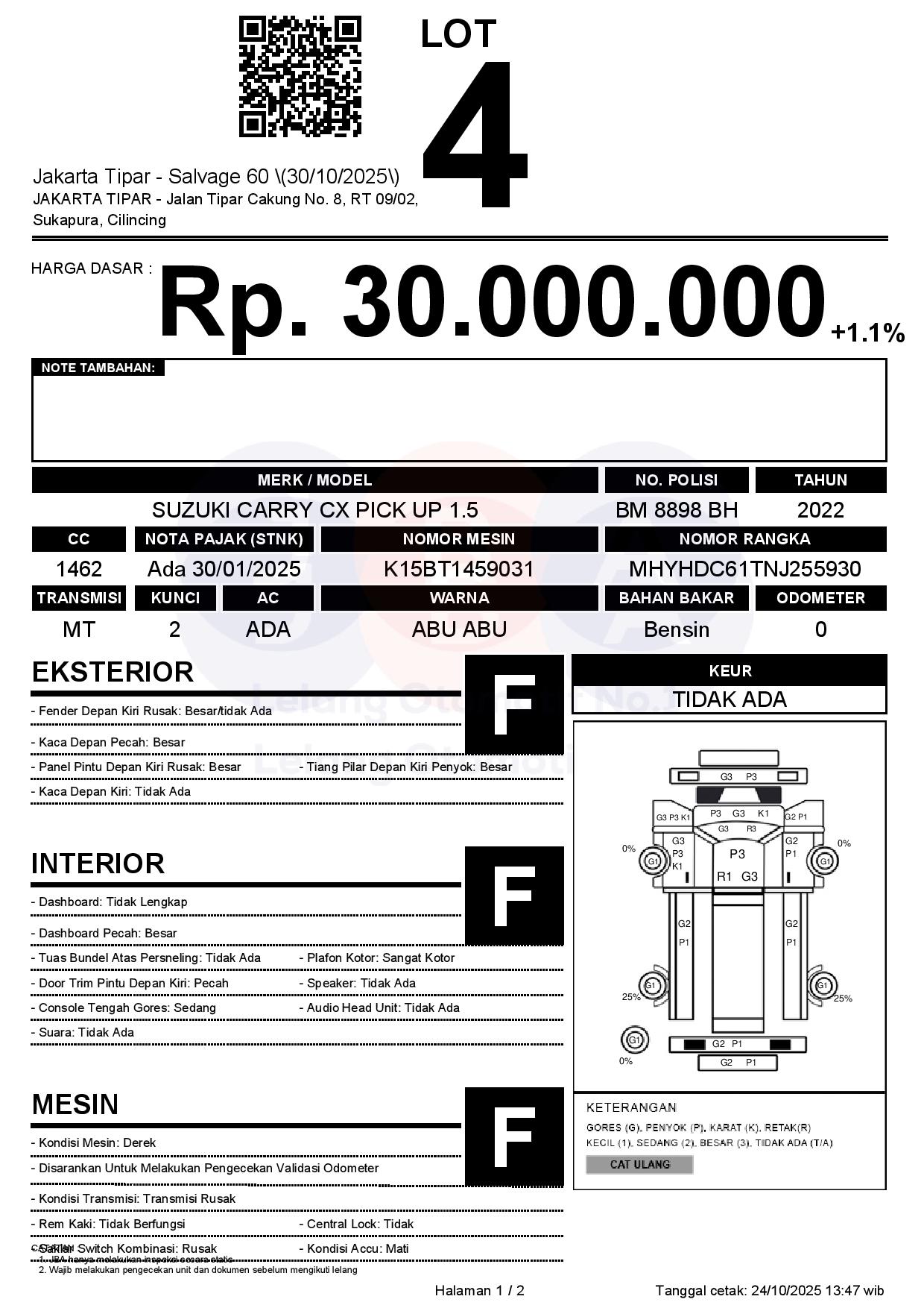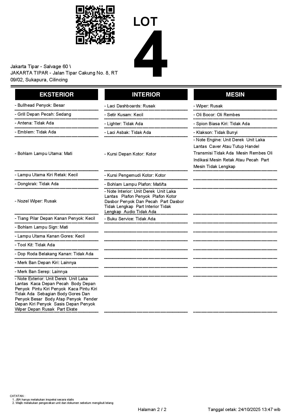 - Kondisi objek lelang dilelang apa adanya, baik kondisi fisik, mesin maupun legalitas kendaraan. Jika terdapat kekurangan/cacat baik yang terlihat maupun yang tidak terlihat, maka semua akan menjadi tanggung jawab/risiko Pemenang Lelang. Oleh karena itu, Pemenang Lelang melepaskan segala hak untuk menuntut dan/atau meminta ganti rugi atas hal tersebut kepada JBA.