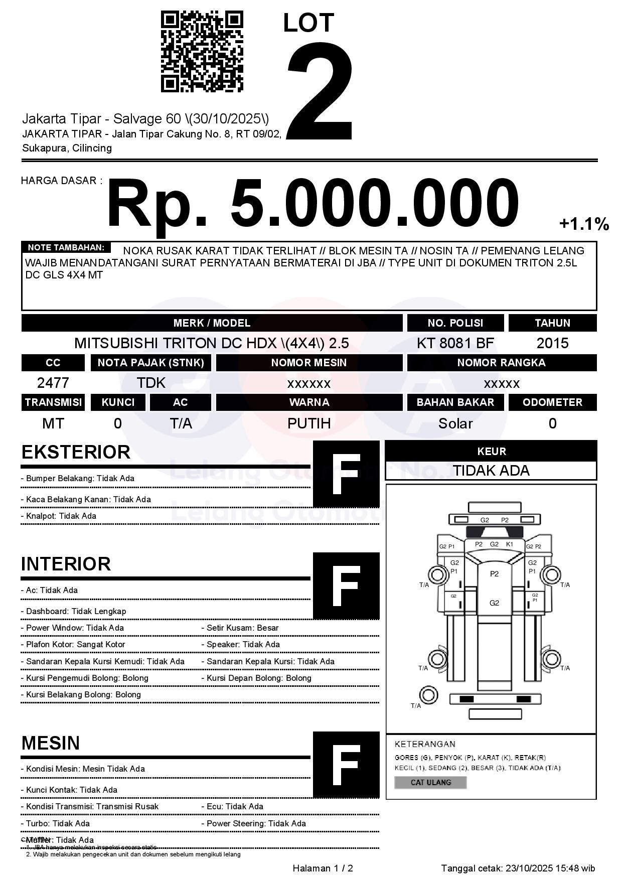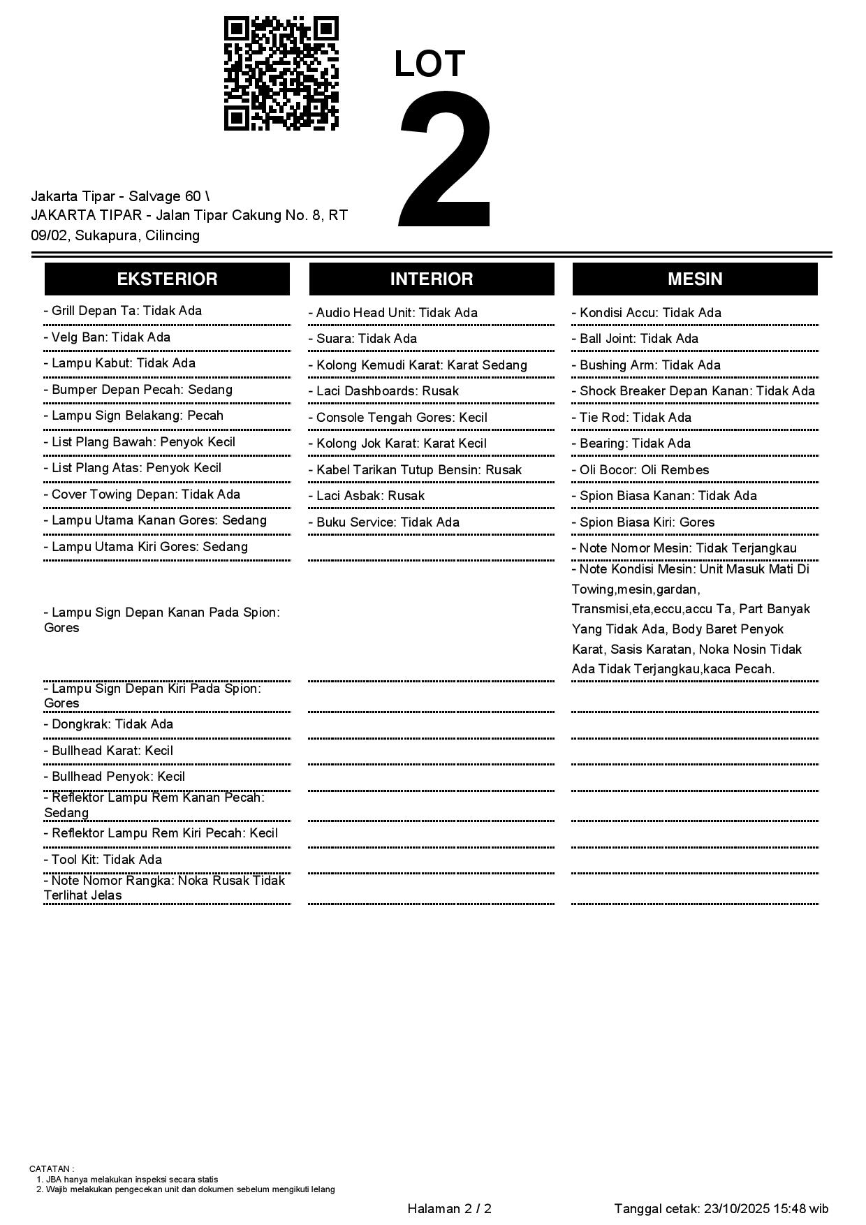 - Kondisi objek lelang dilelang apa adanya, baik kondisi fisik, mesin maupun legalitas kendaraan. Jika terdapat kekurangan/cacat baik yang terlihat maupun yang tidak terlihat, maka semua akan menjadi tanggung jawab/risiko Pemenang Lelang. Oleh karena itu, Pemenang Lelang melepaskan segala hak untuk menuntut dan/atau meminta ganti rugi atas hal tersebut kepada JBA.