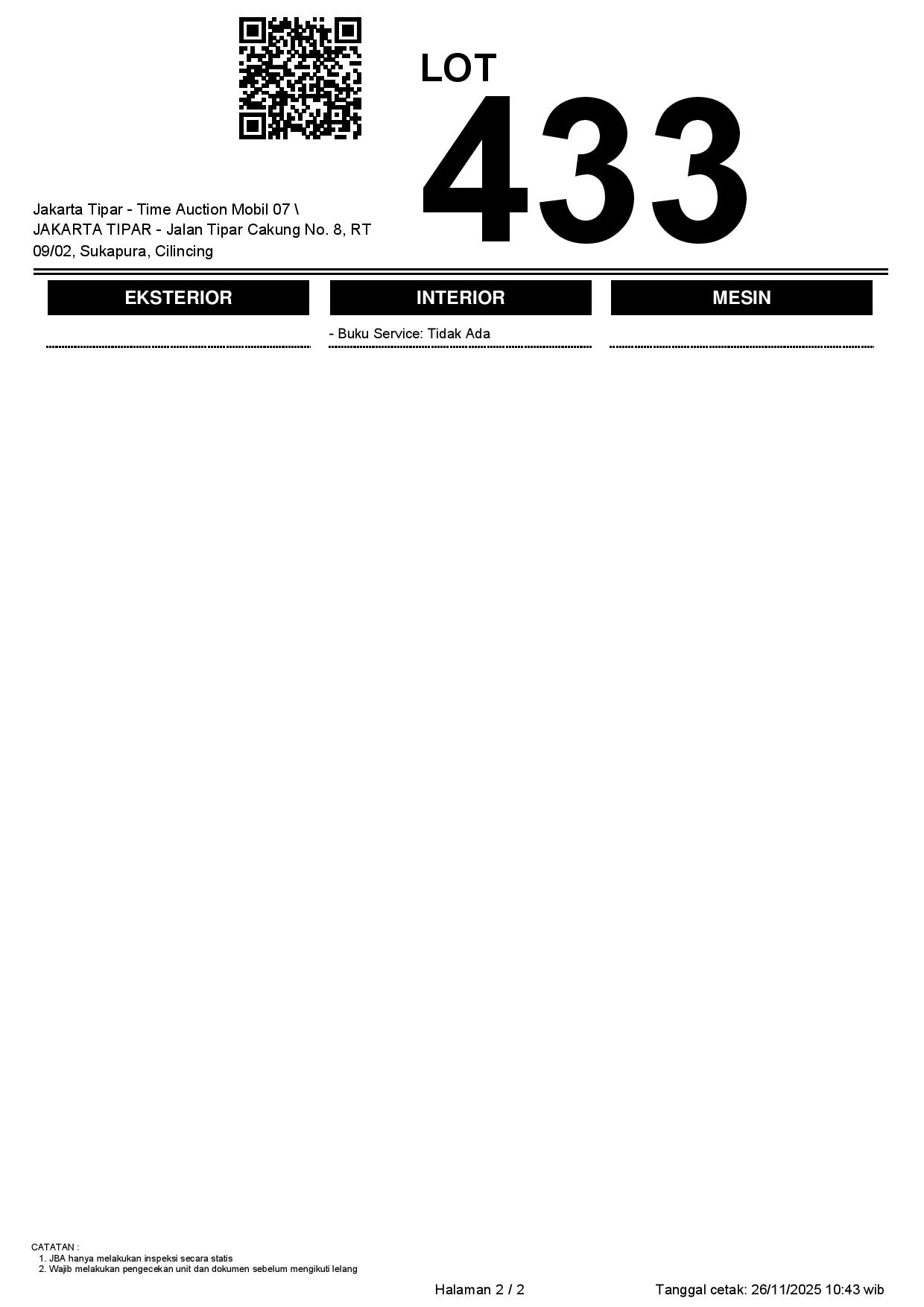 - Kondisi objek lelang dilelang apa adanya, baik kondisi fisik, mesin maupun legalitas kendaraan. Jika terdapat kekurangan/cacat baik yang terlihat maupun yang tidak terlihat, maka semua akan menjadi tanggung jawab/risiko Pemenang Lelang. Oleh karena itu, Pemenang Lelang melepaskan segala hak untuk menuntut dan/atau meminta ganti rugi atas hal tersebut kepada JBA.