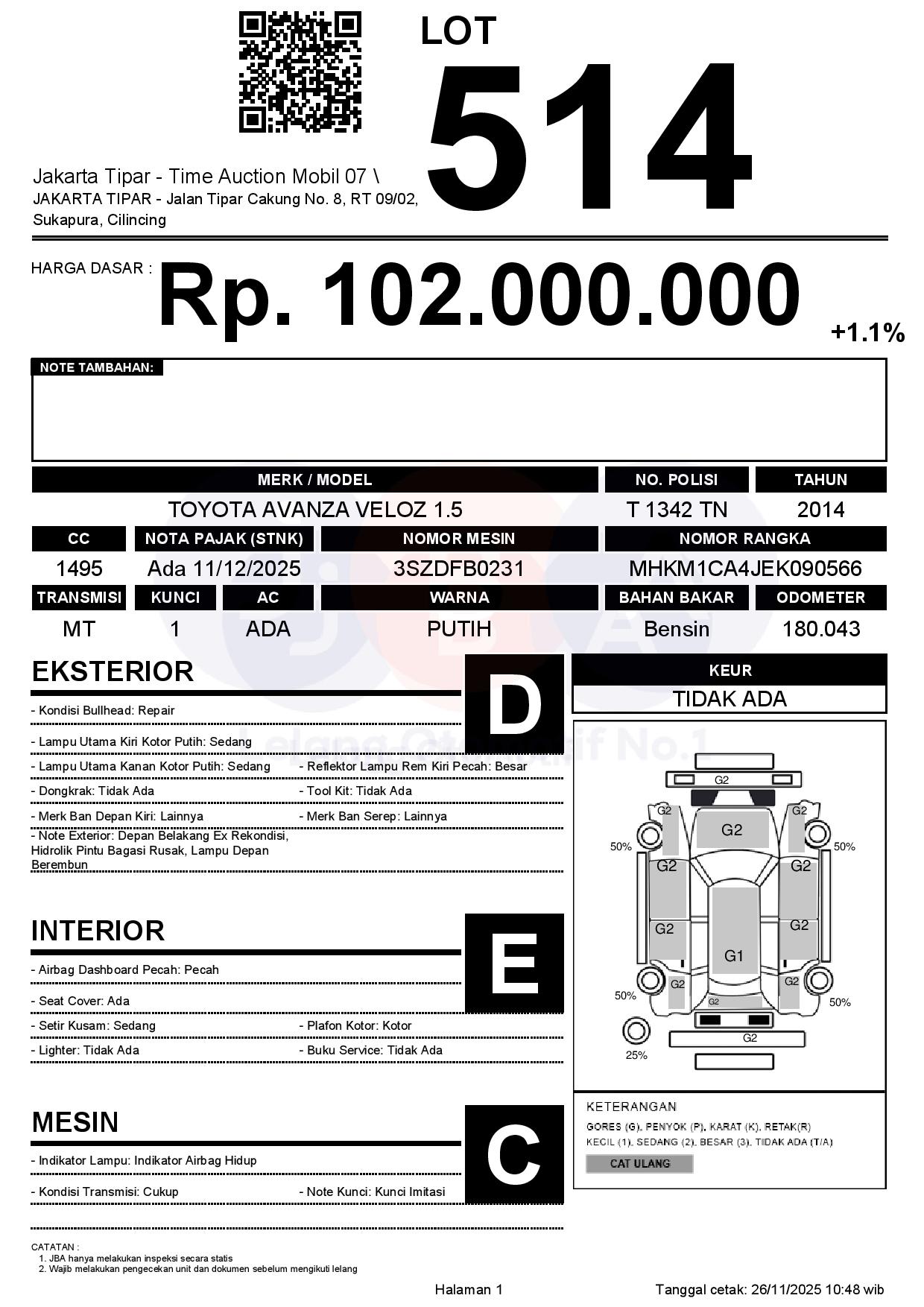 - Kondisi objek lelang dilelang apa adanya, baik kondisi fisik, mesin maupun legalitas kendaraan. Jika terdapat kekurangan/cacat baik yang terlihat maupun yang tidak terlihat, maka semua akan menjadi tanggung jawab/risiko Pemenang Lelang. Oleh karena itu, Pemenang Lelang melepaskan segala hak untuk menuntut dan/atau meminta ganti rugi atas hal tersebut kepada JBA.