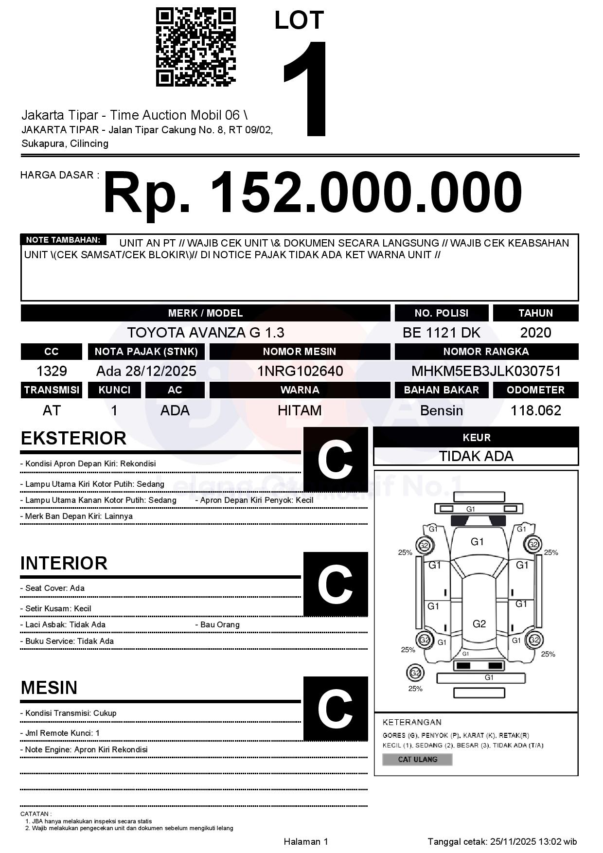 - Kondisi objek lelang dilelang apa adanya, baik kondisi fisik, mesin maupun legalitas kendaraan. Jika terdapat kekurangan/cacat baik yang terlihat maupun yang tidak terlihat, maka semua akan menjadi tanggung jawab/risiko Pemenang Lelang. Oleh karena itu, Pemenang Lelang melepaskan segala hak untuk menuntut dan/atau meminta ganti rugi atas hal tersebut kepada JBA.