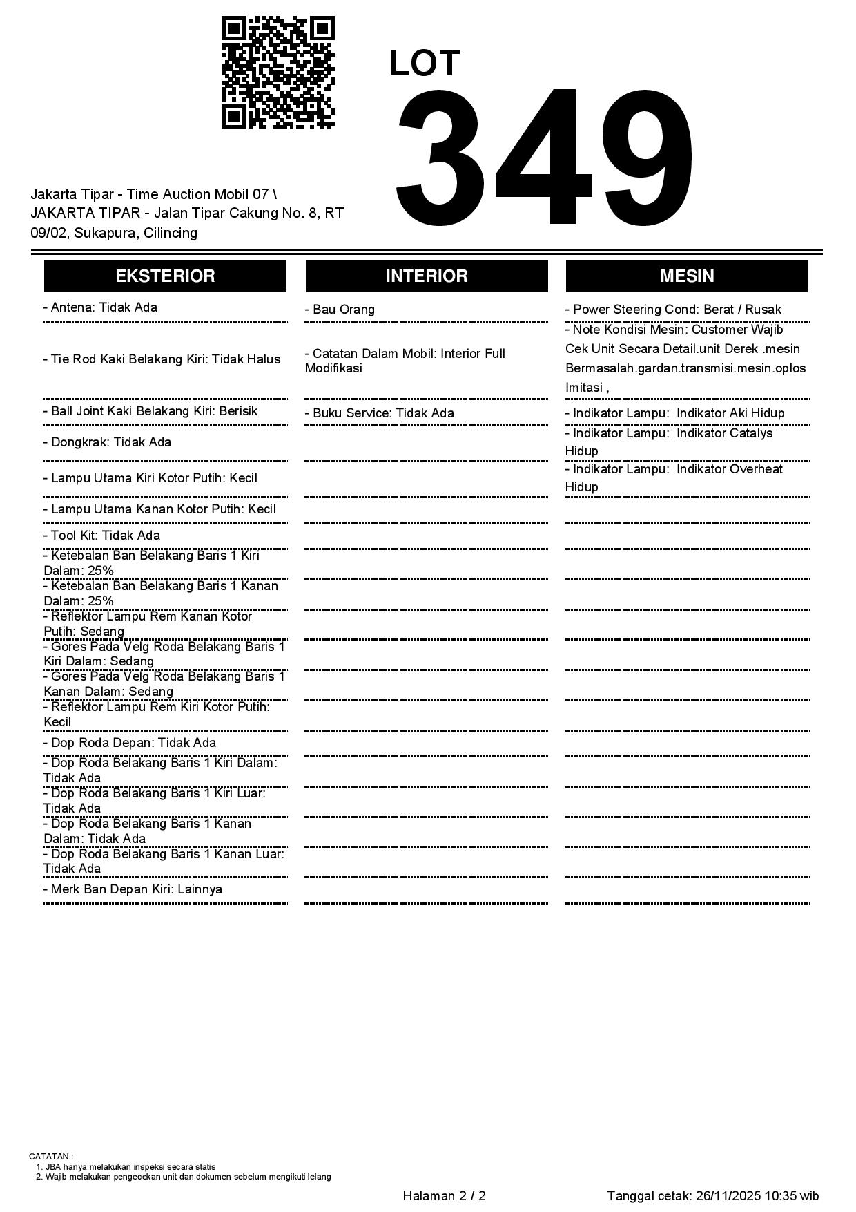 - Kondisi objek lelang dilelang apa adanya, baik kondisi fisik, mesin maupun legalitas kendaraan. Jika terdapat kekurangan/cacat baik yang terlihat maupun yang tidak terlihat, maka semua akan menjadi tanggung jawab/risiko Pemenang Lelang. Oleh karena itu, Pemenang Lelang melepaskan segala hak untuk menuntut dan/atau meminta ganti rugi atas hal tersebut kepada JBA.