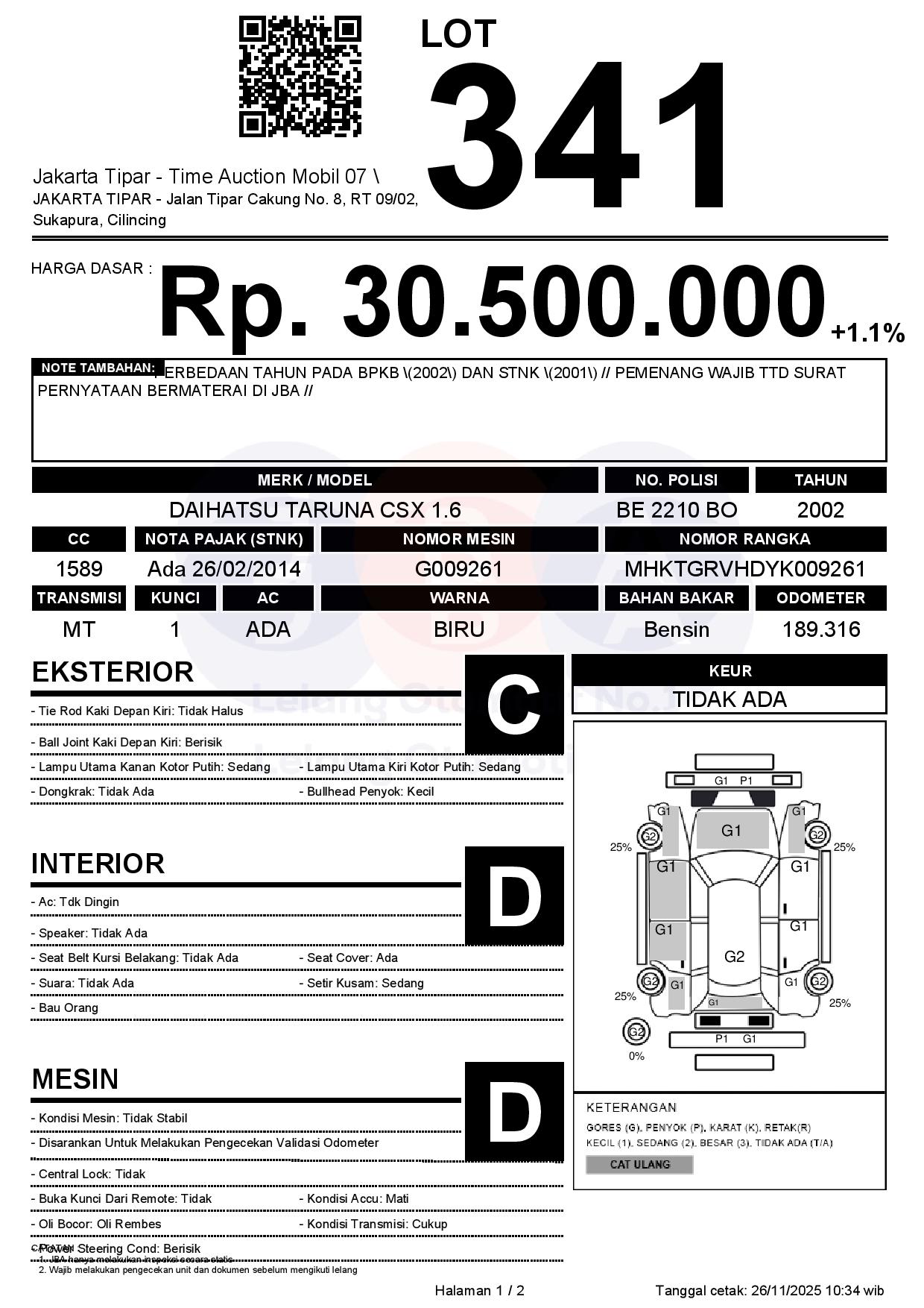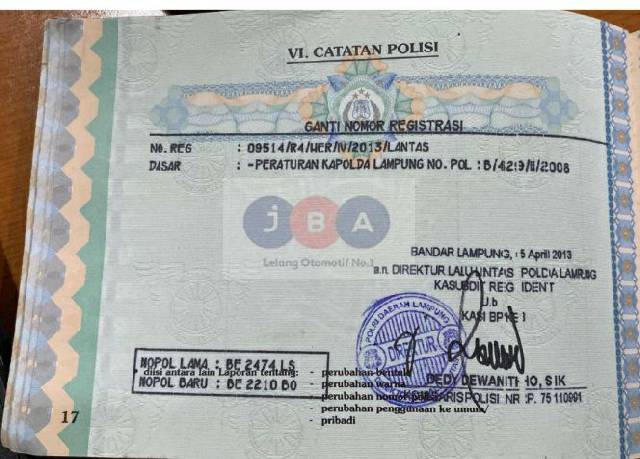 - Kondisi objek lelang dilelang apa adanya, baik kondisi fisik, mesin maupun legalitas kendaraan. Jika terdapat kekurangan/cacat baik yang terlihat maupun yang tidak terlihat, maka semua akan menjadi tanggung jawab/risiko Pemenang Lelang. Oleh karena itu, Pemenang Lelang melepaskan segala hak untuk menuntut dan/atau meminta ganti rugi atas hal tersebut kepada JBA.