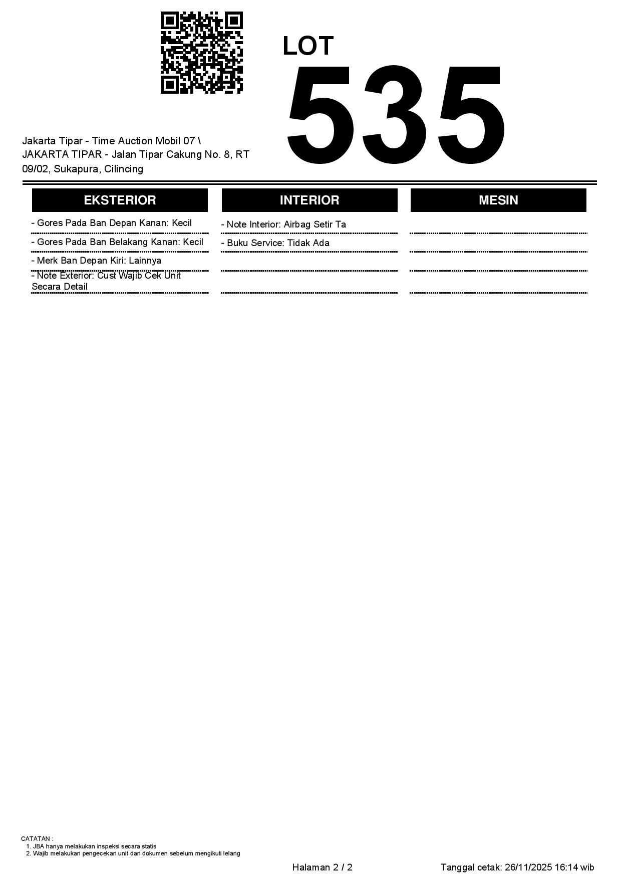 - Kondisi objek lelang dilelang apa adanya, baik kondisi fisik, mesin maupun legalitas kendaraan. Jika terdapat kekurangan/cacat baik yang terlihat maupun yang tidak terlihat, maka semua akan menjadi tanggung jawab/risiko Pemenang Lelang. Oleh karena itu, Pemenang Lelang melepaskan segala hak untuk menuntut dan/atau meminta ganti rugi atas hal tersebut kepada JBA.