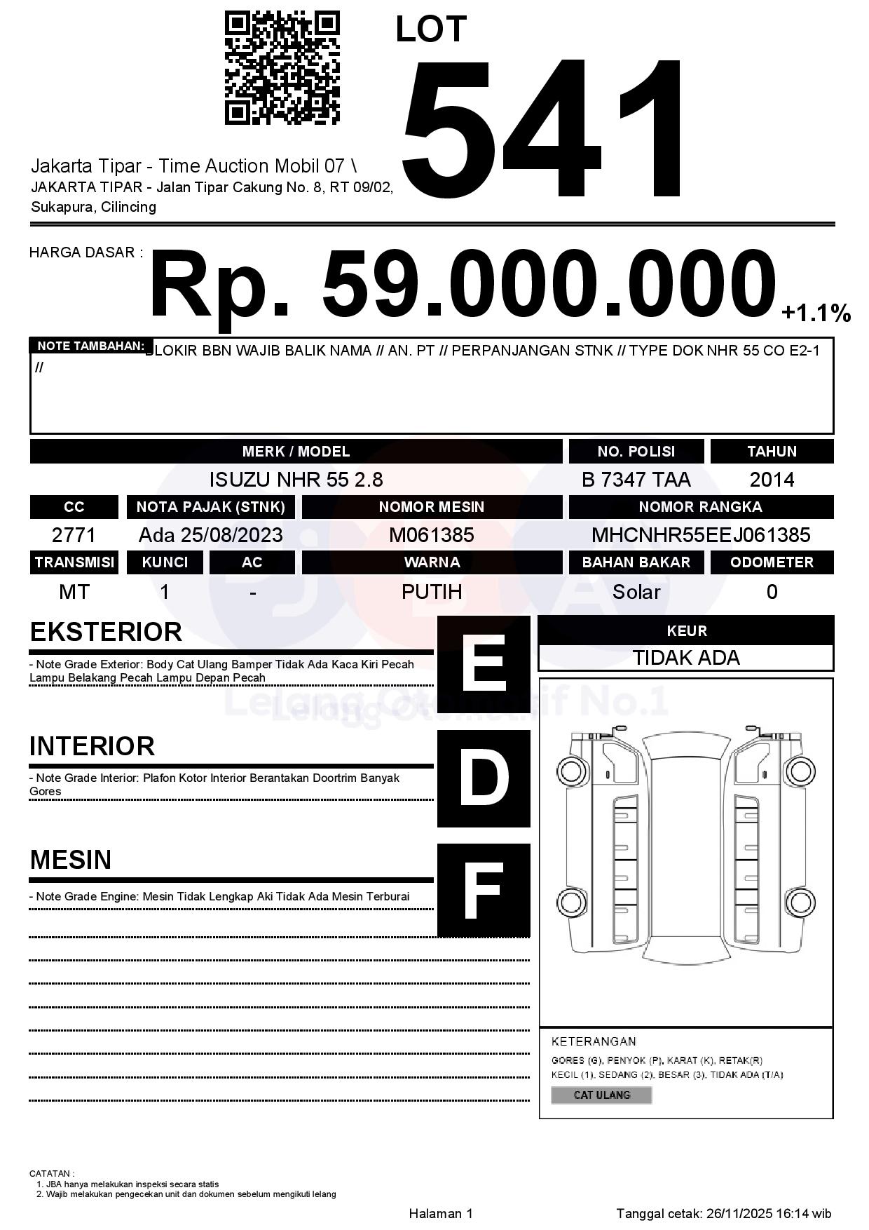 - Kondisi objek lelang dilelang apa adanya, baik kondisi fisik, mesin maupun legalitas kendaraan. Jika terdapat kekurangan/cacat baik yang terlihat maupun yang tidak terlihat, maka semua akan menjadi tanggung jawab/risiko Pemenang Lelang. Oleh karena itu, Pemenang Lelang melepaskan segala hak untuk menuntut dan/atau meminta ganti rugi atas hal tersebut kepada JBA.