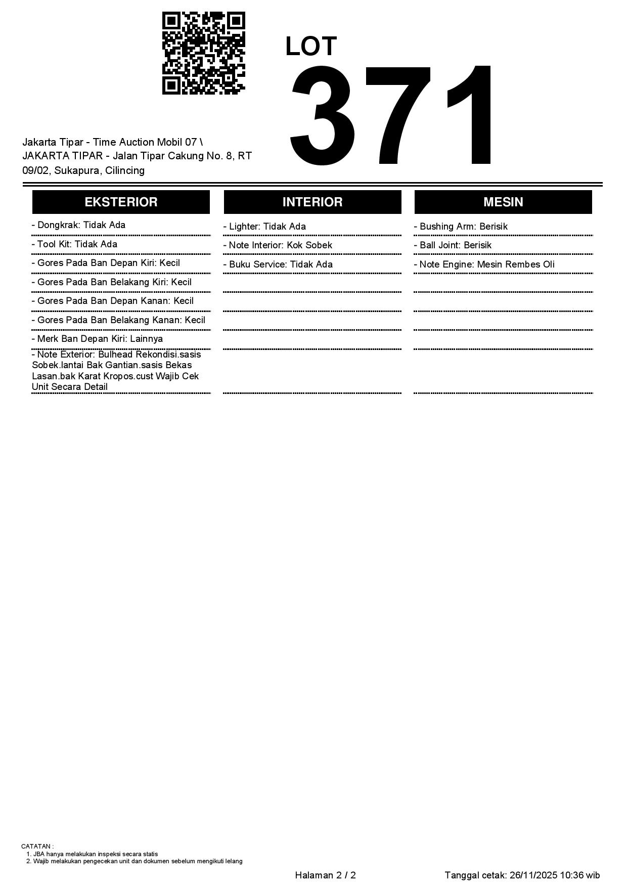 - Kondisi objek lelang dilelang apa adanya, baik kondisi fisik, mesin maupun legalitas kendaraan. Jika terdapat kekurangan/cacat baik yang terlihat maupun yang tidak terlihat, maka semua akan menjadi tanggung jawab/risiko Pemenang Lelang. Oleh karena itu, Pemenang Lelang melepaskan segala hak untuk menuntut dan/atau meminta ganti rugi atas hal tersebut kepada JBA.