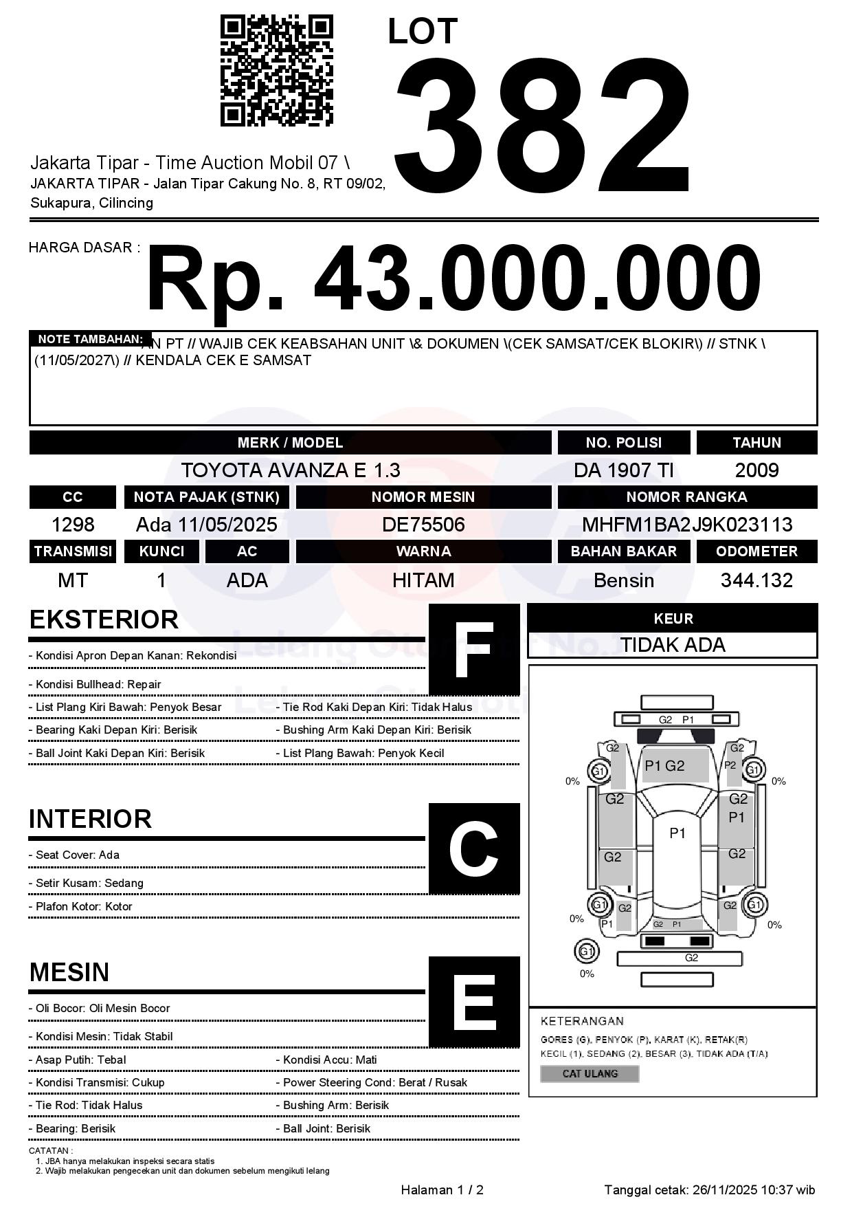 - Kondisi objek lelang dilelang apa adanya, baik kondisi fisik, mesin maupun legalitas kendaraan. Jika terdapat kekurangan/cacat baik yang terlihat maupun yang tidak terlihat, maka semua akan menjadi tanggung jawab/risiko Pemenang Lelang. Oleh karena itu, Pemenang Lelang melepaskan segala hak untuk menuntut dan/atau meminta ganti rugi atas hal tersebut kepada JBA.