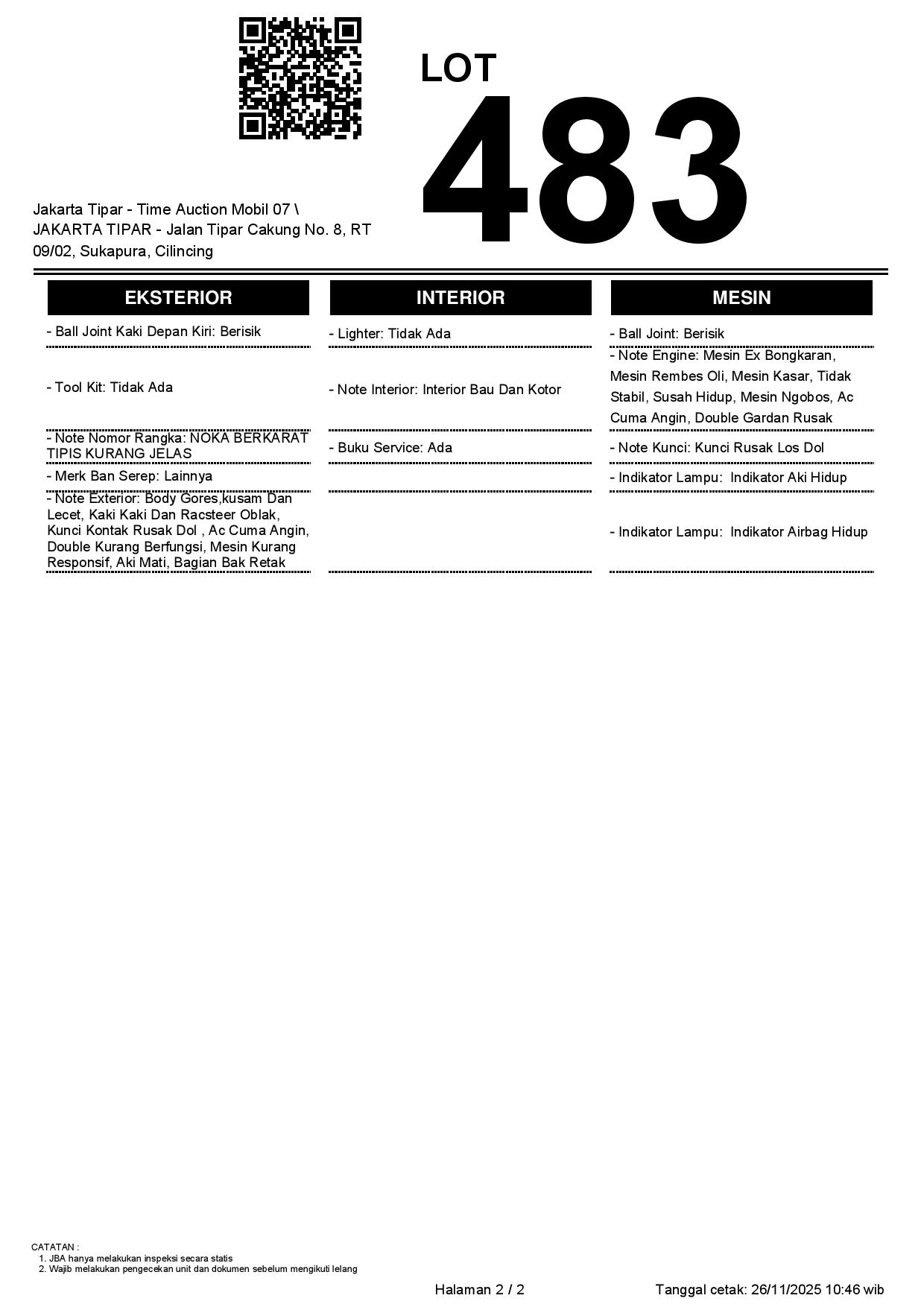 - Kondisi objek lelang dilelang apa adanya, baik kondisi fisik, mesin maupun legalitas kendaraan. Jika terdapat kekurangan/cacat baik yang terlihat maupun yang tidak terlihat, maka semua akan menjadi tanggung jawab/risiko Pemenang Lelang. Oleh karena itu, Pemenang Lelang melepaskan segala hak untuk menuntut dan/atau meminta ganti rugi atas hal tersebut kepada JBA.