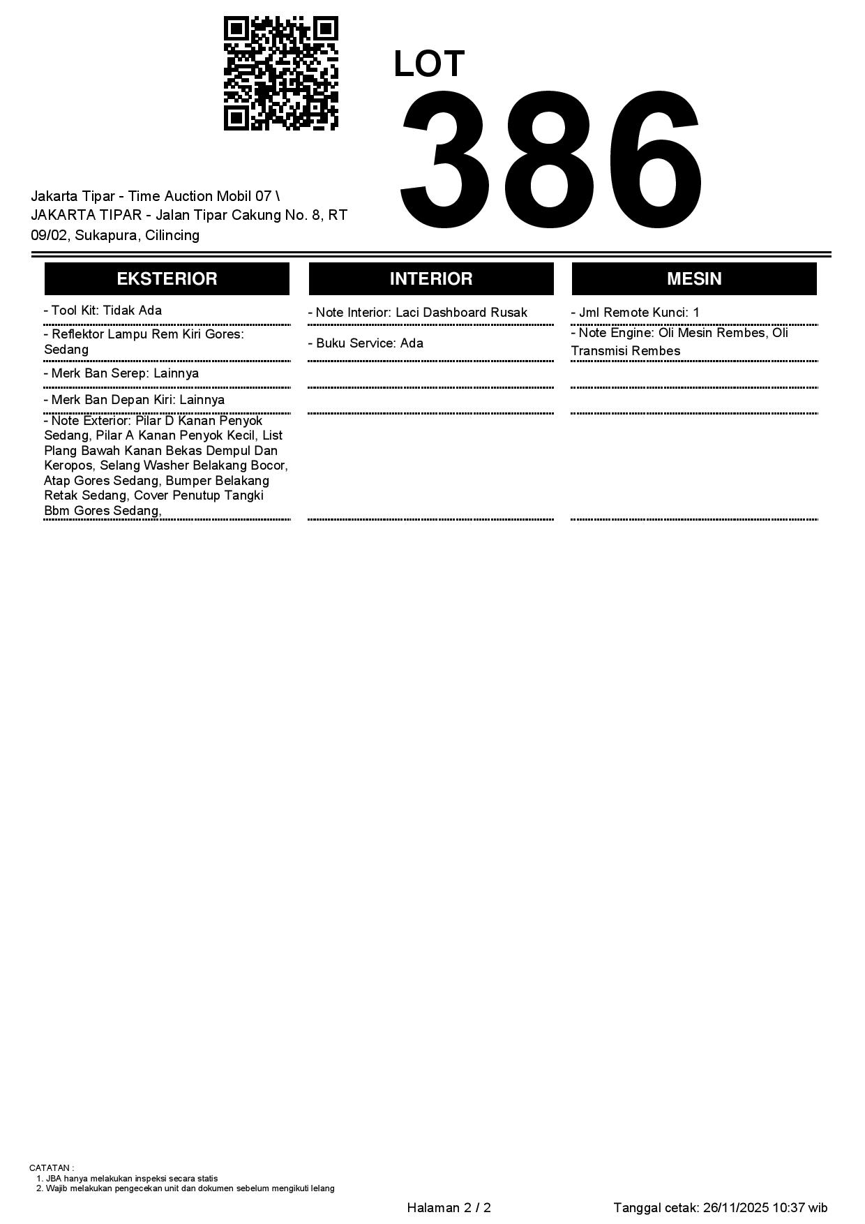- Kondisi objek lelang dilelang apa adanya, baik kondisi fisik, mesin maupun legalitas kendaraan. Jika terdapat kekurangan/cacat baik yang terlihat maupun yang tidak terlihat, maka semua akan menjadi tanggung jawab/risiko Pemenang Lelang. Oleh karena itu, Pemenang Lelang melepaskan segala hak untuk menuntut dan/atau meminta ganti rugi atas hal tersebut kepada JBA.