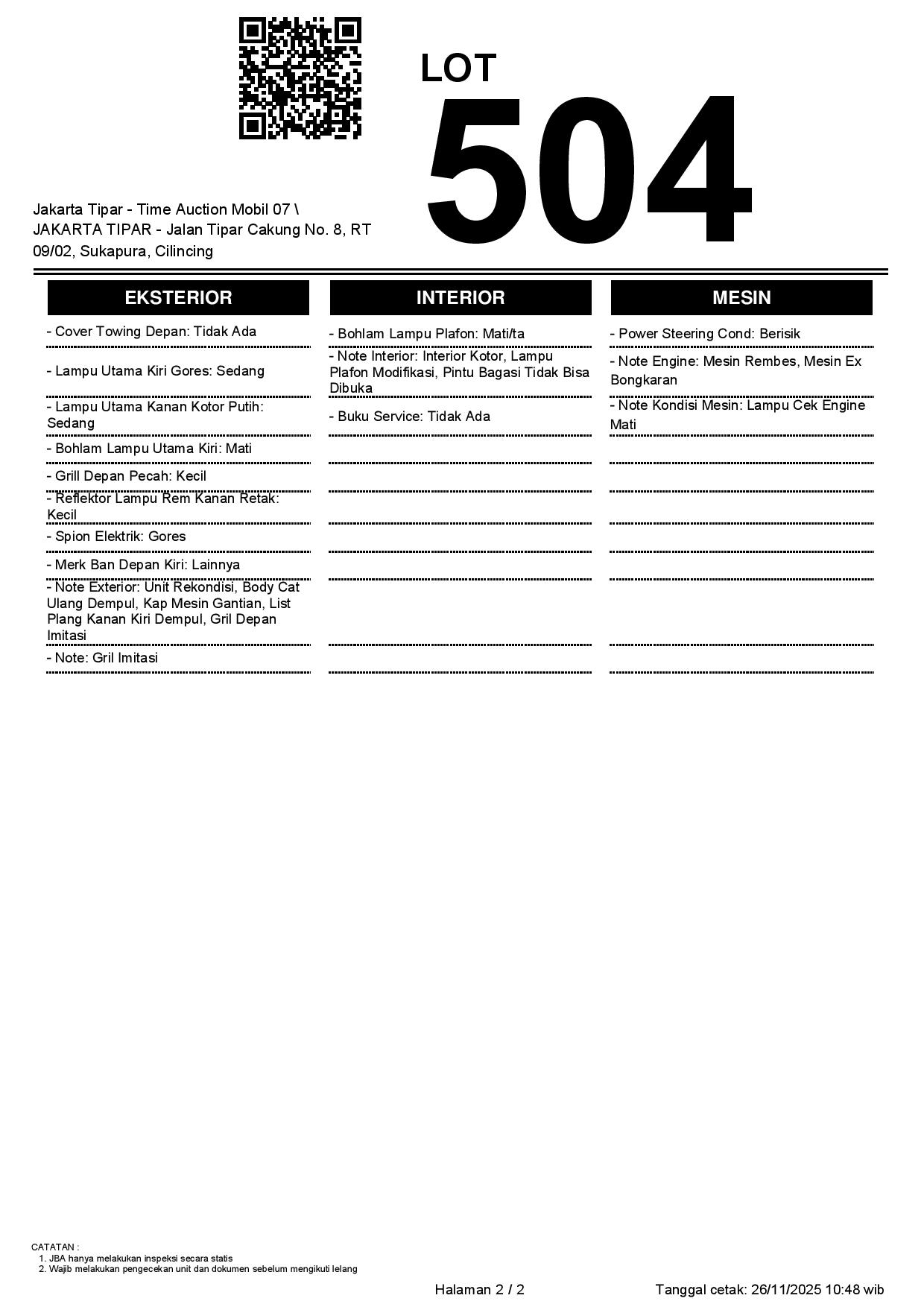 - Kondisi objek lelang dilelang apa adanya, baik kondisi fisik, mesin maupun legalitas kendaraan. Jika terdapat kekurangan/cacat baik yang terlihat maupun yang tidak terlihat, maka semua akan menjadi tanggung jawab/risiko Pemenang Lelang. Oleh karena itu, Pemenang Lelang melepaskan segala hak untuk menuntut dan/atau meminta ganti rugi atas hal tersebut kepada JBA.