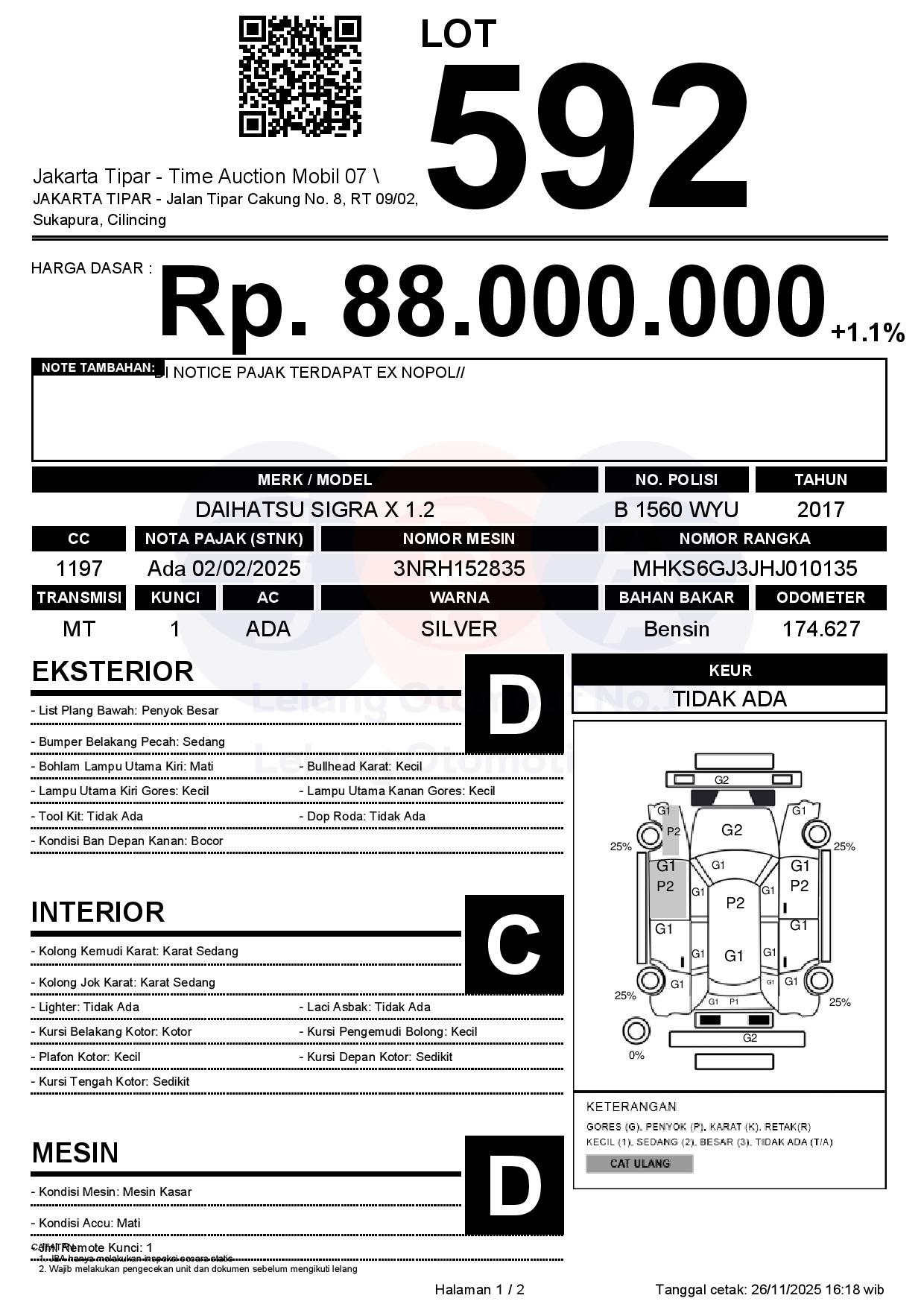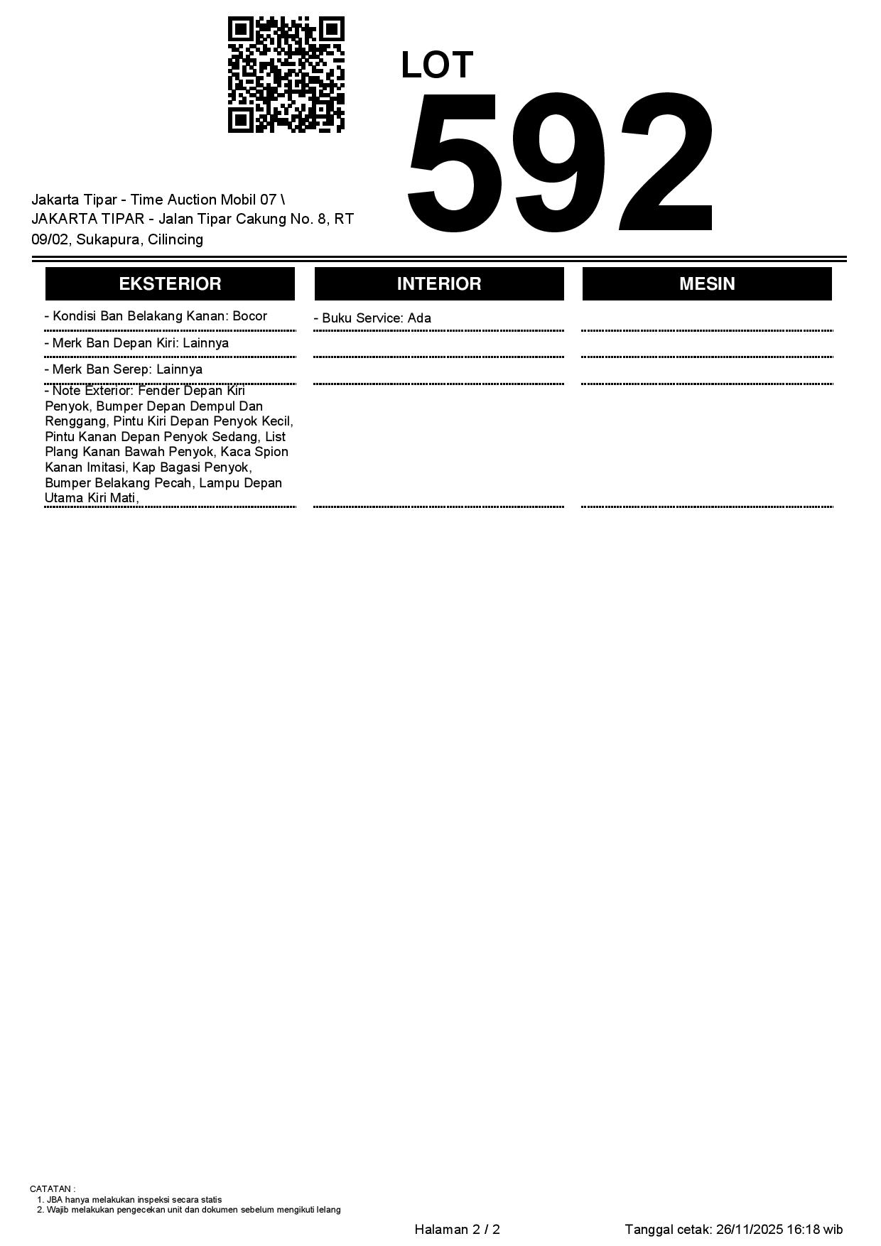 - Kondisi objek lelang dilelang apa adanya, baik kondisi fisik, mesin maupun legalitas kendaraan. Jika terdapat kekurangan/cacat baik yang terlihat maupun yang tidak terlihat, maka semua akan menjadi tanggung jawab/risiko Pemenang Lelang. Oleh karena itu, Pemenang Lelang melepaskan segala hak untuk menuntut dan/atau meminta ganti rugi atas hal tersebut kepada JBA.