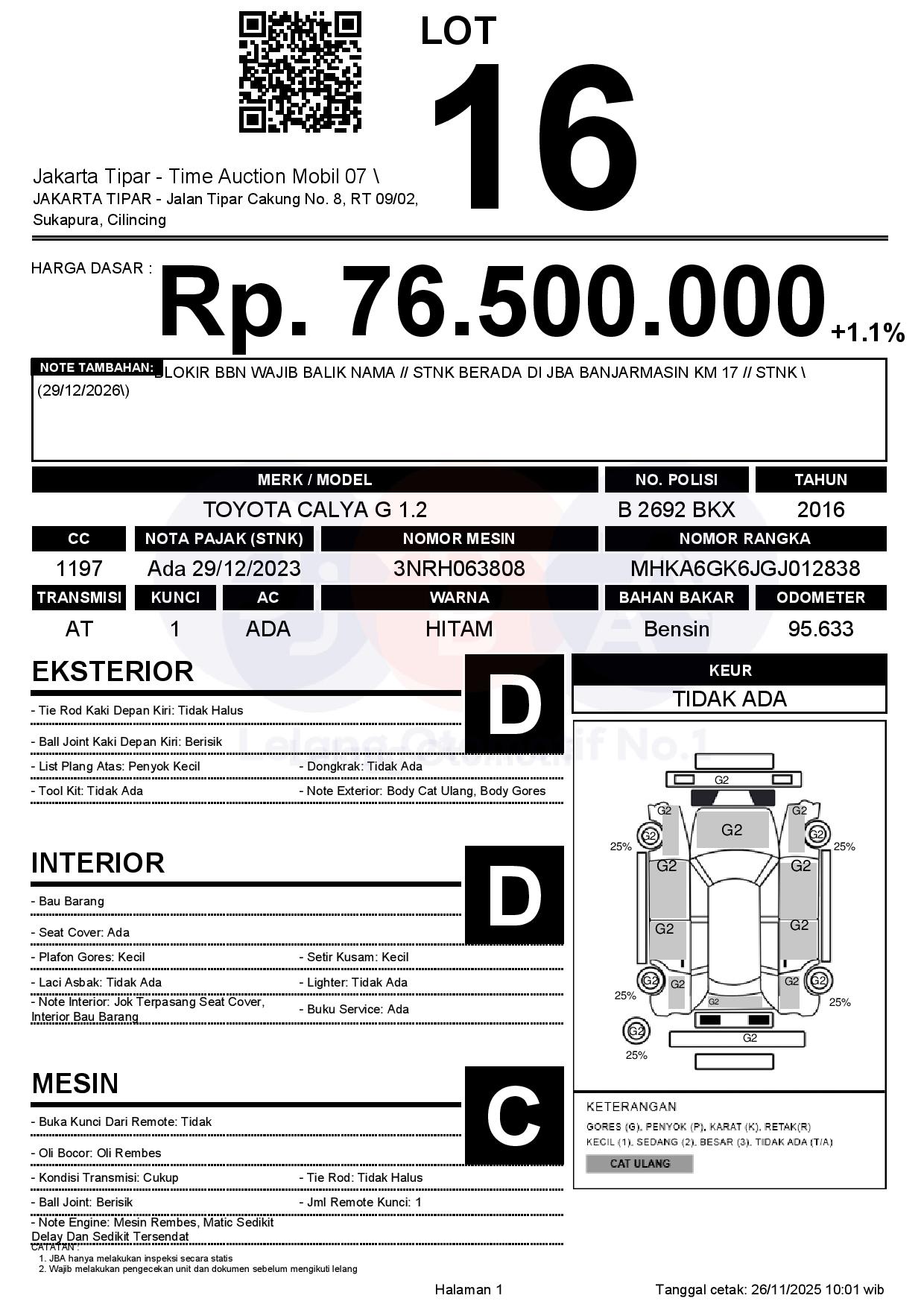 - Kondisi objek lelang dilelang apa adanya, baik kondisi fisik, mesin maupun legalitas kendaraan. Jika terdapat kekurangan/cacat baik yang terlihat maupun yang tidak terlihat, maka semua akan menjadi tanggung jawab/risiko Pemenang Lelang. Oleh karena itu, Pemenang Lelang melepaskan segala hak untuk menuntut dan/atau meminta ganti rugi atas hal tersebut kepada JBA.