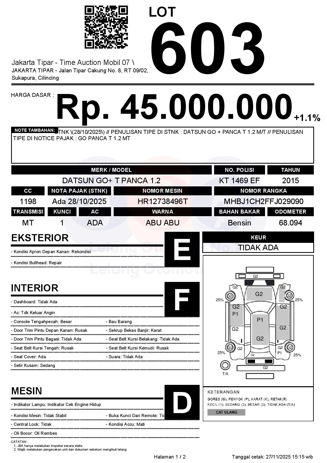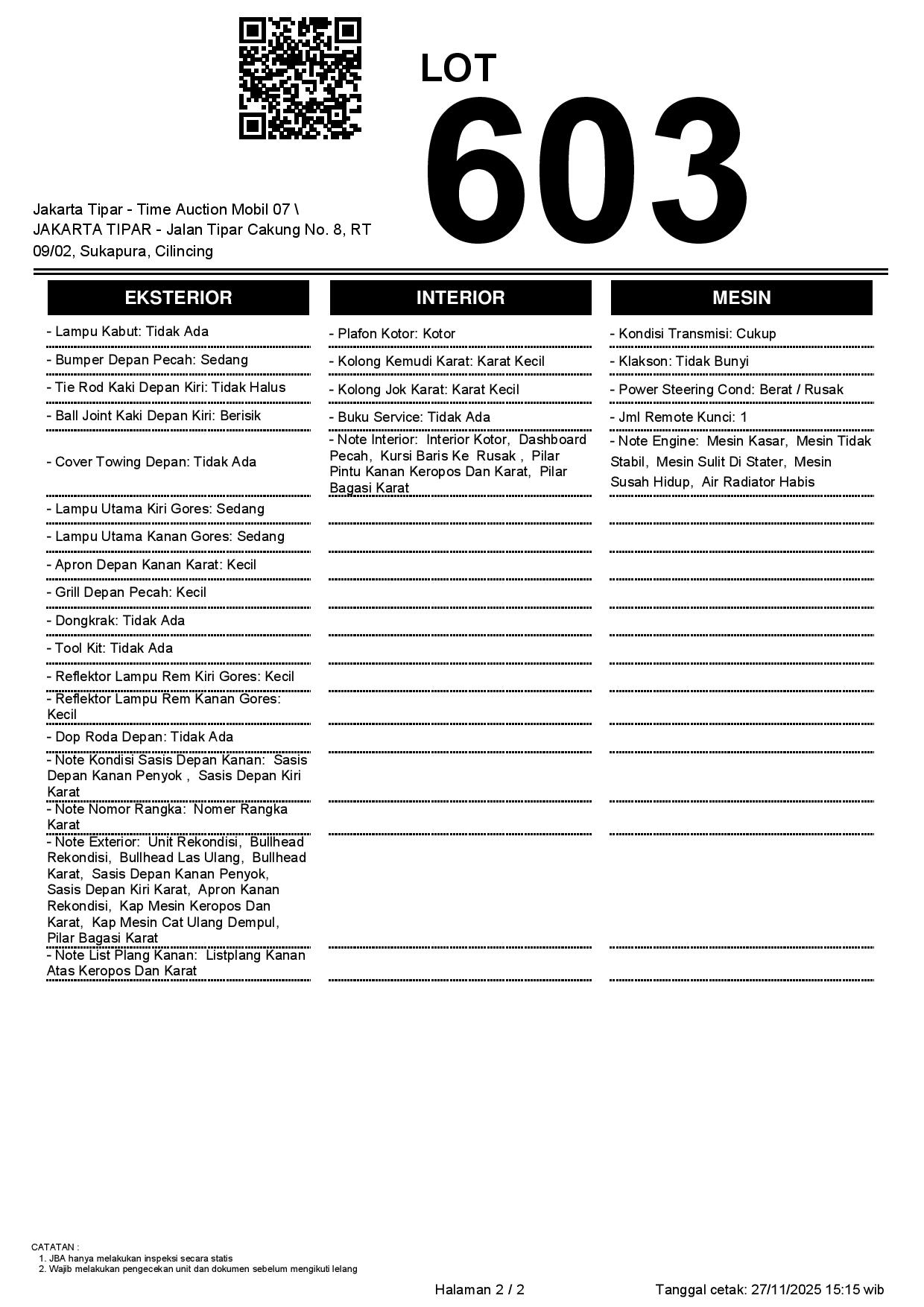 - Kondisi objek lelang dilelang apa adanya, baik kondisi fisik, mesin maupun legalitas kendaraan. Jika terdapat kekurangan/cacat baik yang terlihat maupun yang tidak terlihat, maka semua akan menjadi tanggung jawab/risiko Pemenang Lelang. Oleh karena itu, Pemenang Lelang melepaskan segala hak untuk menuntut dan/atau meminta ganti rugi atas hal tersebut kepada JBA.