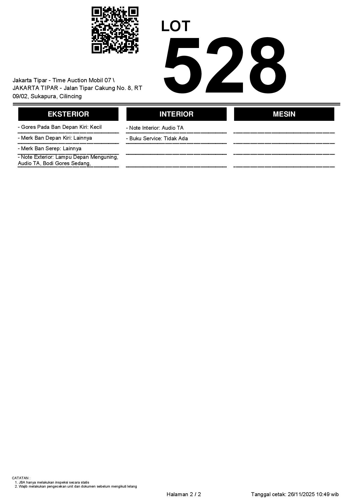 - Kondisi objek lelang dilelang apa adanya, baik kondisi fisik, mesin maupun legalitas kendaraan. Jika terdapat kekurangan/cacat baik yang terlihat maupun yang tidak terlihat, maka semua akan menjadi tanggung jawab/risiko Pemenang Lelang. Oleh karena itu, Pemenang Lelang melepaskan segala hak untuk menuntut dan/atau meminta ganti rugi atas hal tersebut kepada JBA.