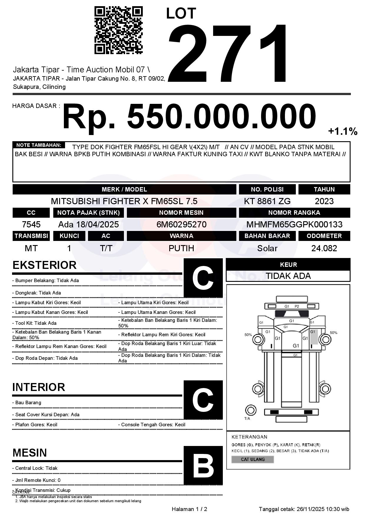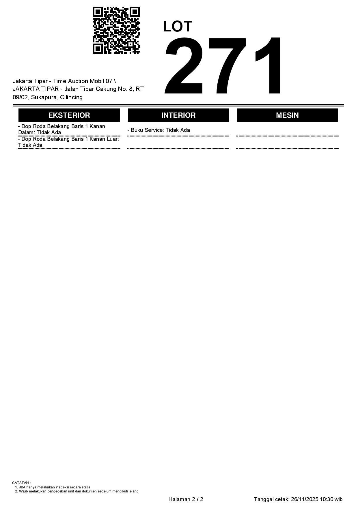 - Kondisi objek lelang dilelang apa adanya, baik kondisi fisik, mesin maupun legalitas kendaraan. Jika terdapat kekurangan/cacat baik yang terlihat maupun yang tidak terlihat, maka semua akan menjadi tanggung jawab/risiko Pemenang Lelang. Oleh karena itu, Pemenang Lelang melepaskan segala hak untuk menuntut dan/atau meminta ganti rugi atas hal tersebut kepada JBA.