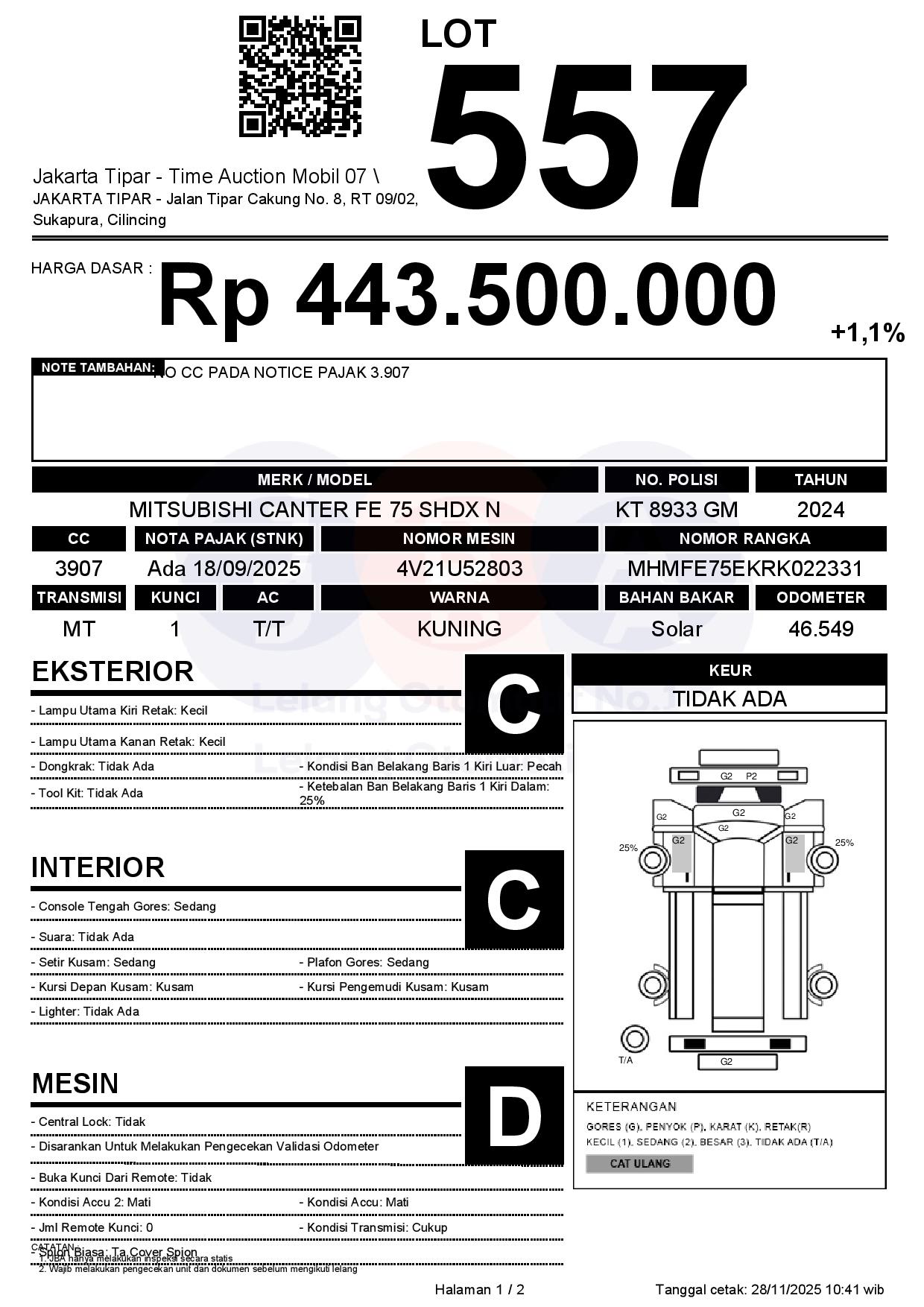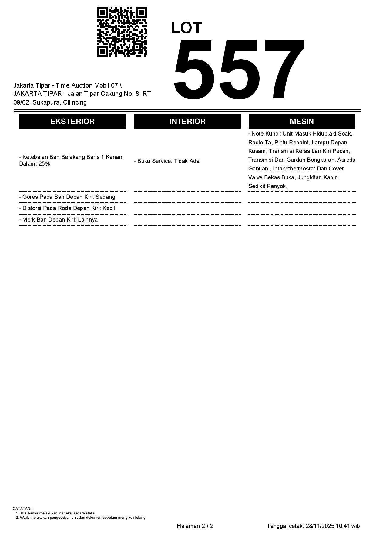 - Kondisi objek lelang dilelang apa adanya, baik kondisi fisik, mesin maupun legalitas kendaraan. Jika terdapat kekurangan/cacat baik yang terlihat maupun yang tidak terlihat, maka semua akan menjadi tanggung jawab/risiko Pemenang Lelang. Oleh karena itu, Pemenang Lelang melepaskan segala hak untuk menuntut dan/atau meminta ganti rugi atas hal tersebut kepada JBA.