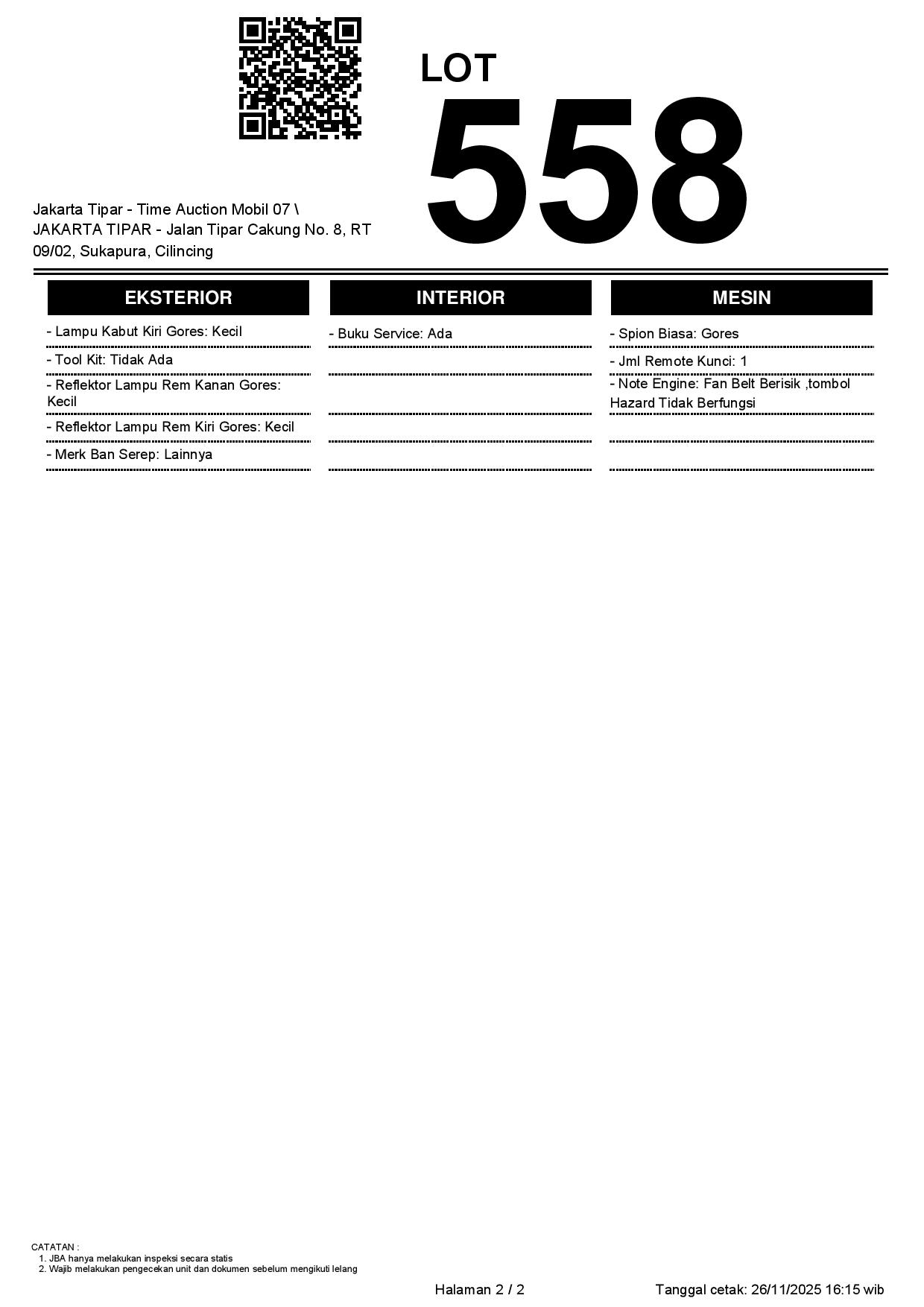 - Kondisi objek lelang dilelang apa adanya, baik kondisi fisik, mesin maupun legalitas kendaraan. Jika terdapat kekurangan/cacat baik yang terlihat maupun yang tidak terlihat, maka semua akan menjadi tanggung jawab/risiko Pemenang Lelang. Oleh karena itu, Pemenang Lelang melepaskan segala hak untuk menuntut dan/atau meminta ganti rugi atas hal tersebut kepada JBA.
