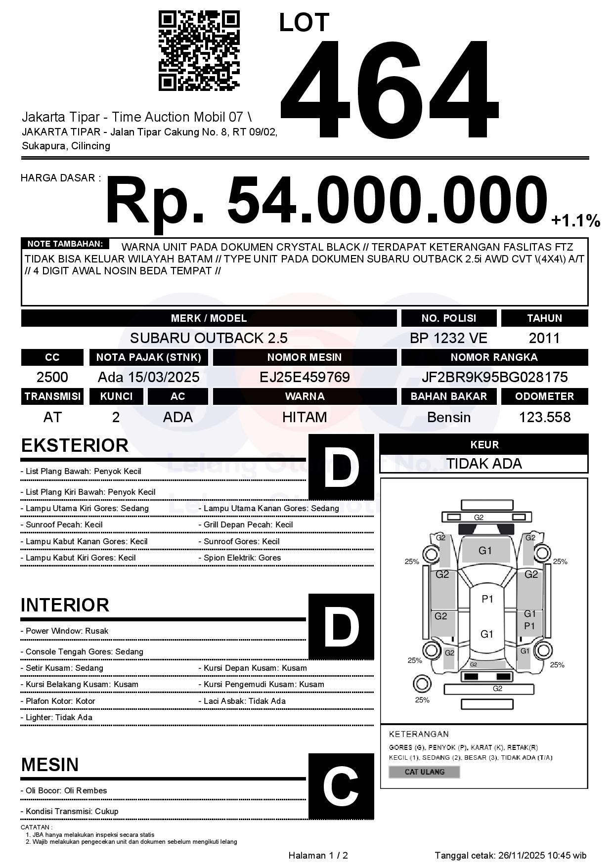 - Kondisi objek lelang dilelang apa adanya, baik kondisi fisik, mesin maupun legalitas kendaraan. Jika terdapat kekurangan/cacat baik yang terlihat maupun yang tidak terlihat, maka semua akan menjadi tanggung jawab/risiko Pemenang Lelang. Oleh karena itu, Pemenang Lelang melepaskan segala hak untuk menuntut dan/atau meminta ganti rugi atas hal tersebut kepada JBA.