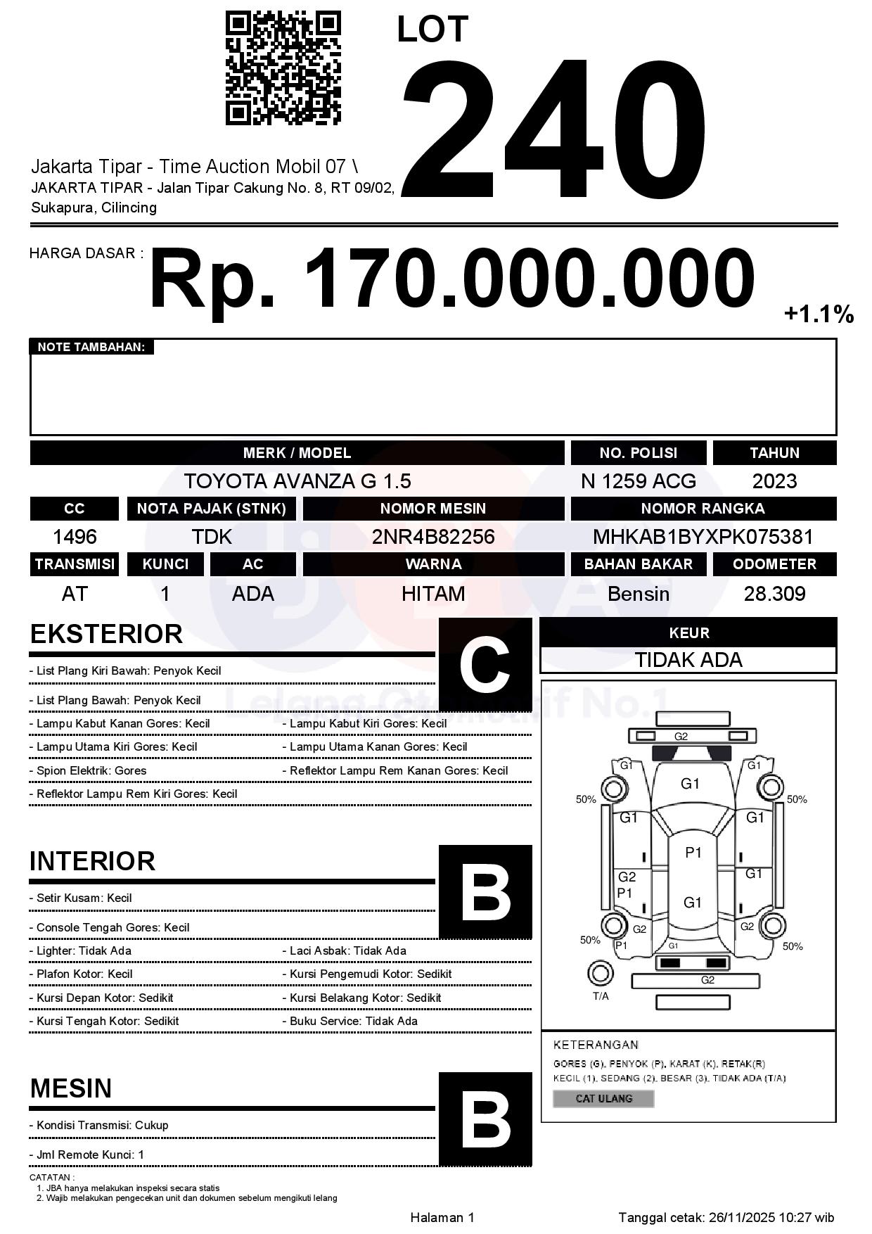 - Kondisi objek lelang dilelang apa adanya, baik kondisi fisik, mesin maupun legalitas kendaraan. Jika terdapat kekurangan/cacat baik yang terlihat maupun yang tidak terlihat, maka semua akan menjadi tanggung jawab/risiko Pemenang Lelang. Oleh karena itu, Pemenang Lelang melepaskan segala hak untuk menuntut dan/atau meminta ganti rugi atas hal tersebut kepada JBA.