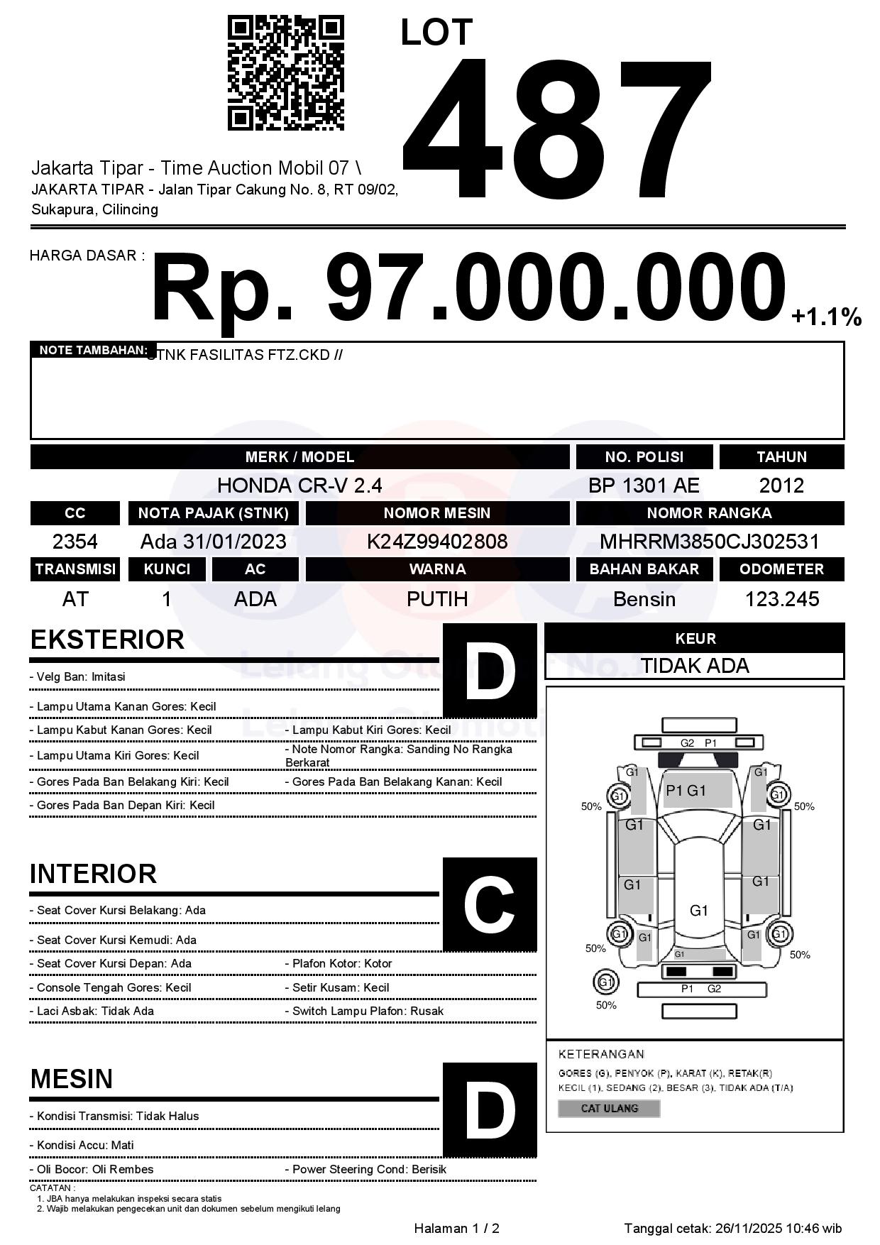 - Kondisi objek lelang dilelang apa adanya, baik kondisi fisik, mesin maupun legalitas kendaraan. Jika terdapat kekurangan/cacat baik yang terlihat maupun yang tidak terlihat, maka semua akan menjadi tanggung jawab/risiko Pemenang Lelang. Oleh karena itu, Pemenang Lelang melepaskan segala hak untuk menuntut dan/atau meminta ganti rugi atas hal tersebut kepada JBA.