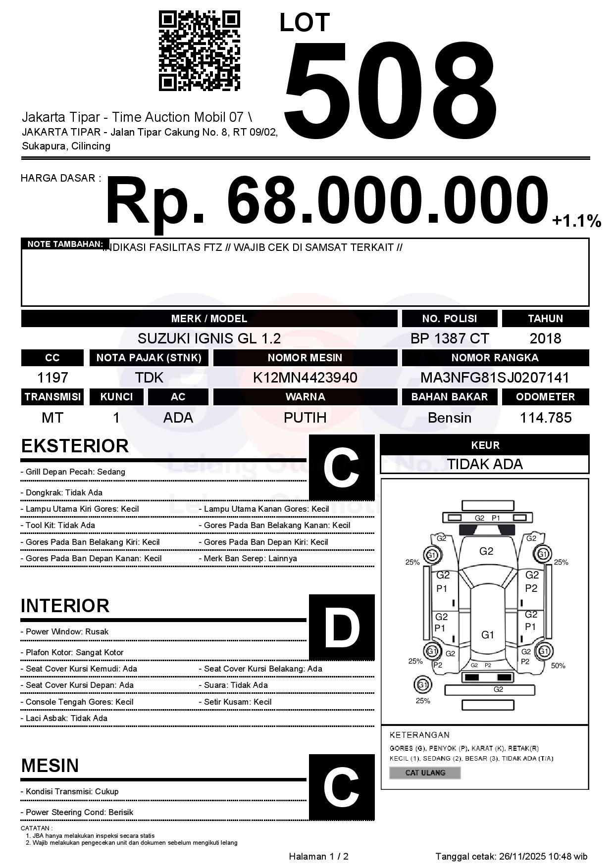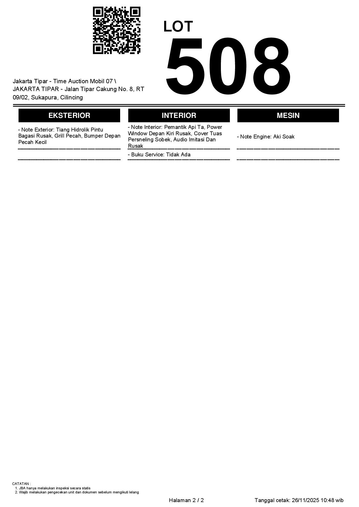 - Kondisi objek lelang dilelang apa adanya, baik kondisi fisik, mesin maupun legalitas kendaraan. Jika terdapat kekurangan/cacat baik yang terlihat maupun yang tidak terlihat, maka semua akan menjadi tanggung jawab/risiko Pemenang Lelang. Oleh karena itu, Pemenang Lelang melepaskan segala hak untuk menuntut dan/atau meminta ganti rugi atas hal tersebut kepada JBA.