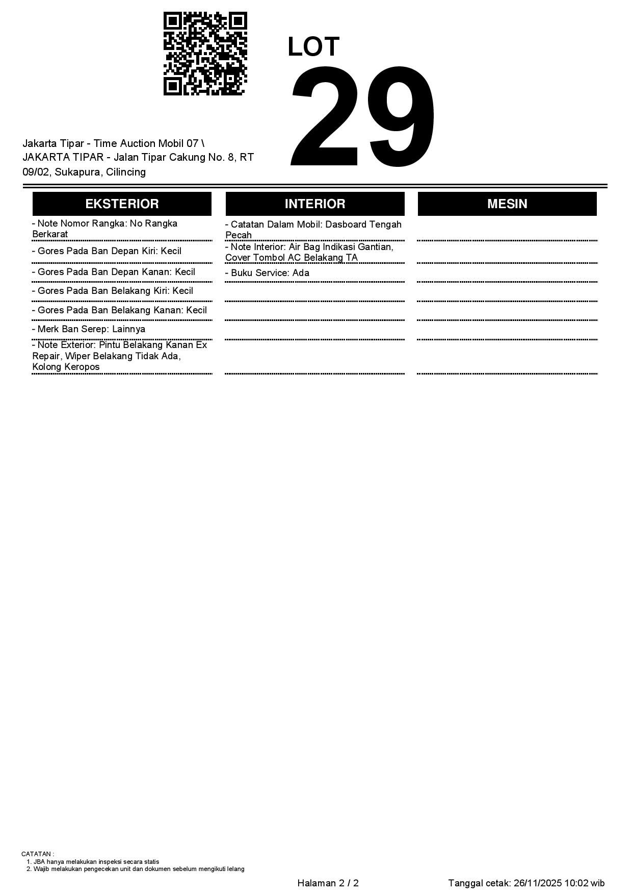 - Kondisi objek lelang dilelang apa adanya, baik kondisi fisik, mesin maupun legalitas kendaraan. Jika terdapat kekurangan/cacat baik yang terlihat maupun yang tidak terlihat, maka semua akan menjadi tanggung jawab/risiko Pemenang Lelang. Oleh karena itu, Pemenang Lelang melepaskan segala hak untuk menuntut dan/atau meminta ganti rugi atas hal tersebut kepada JBA.