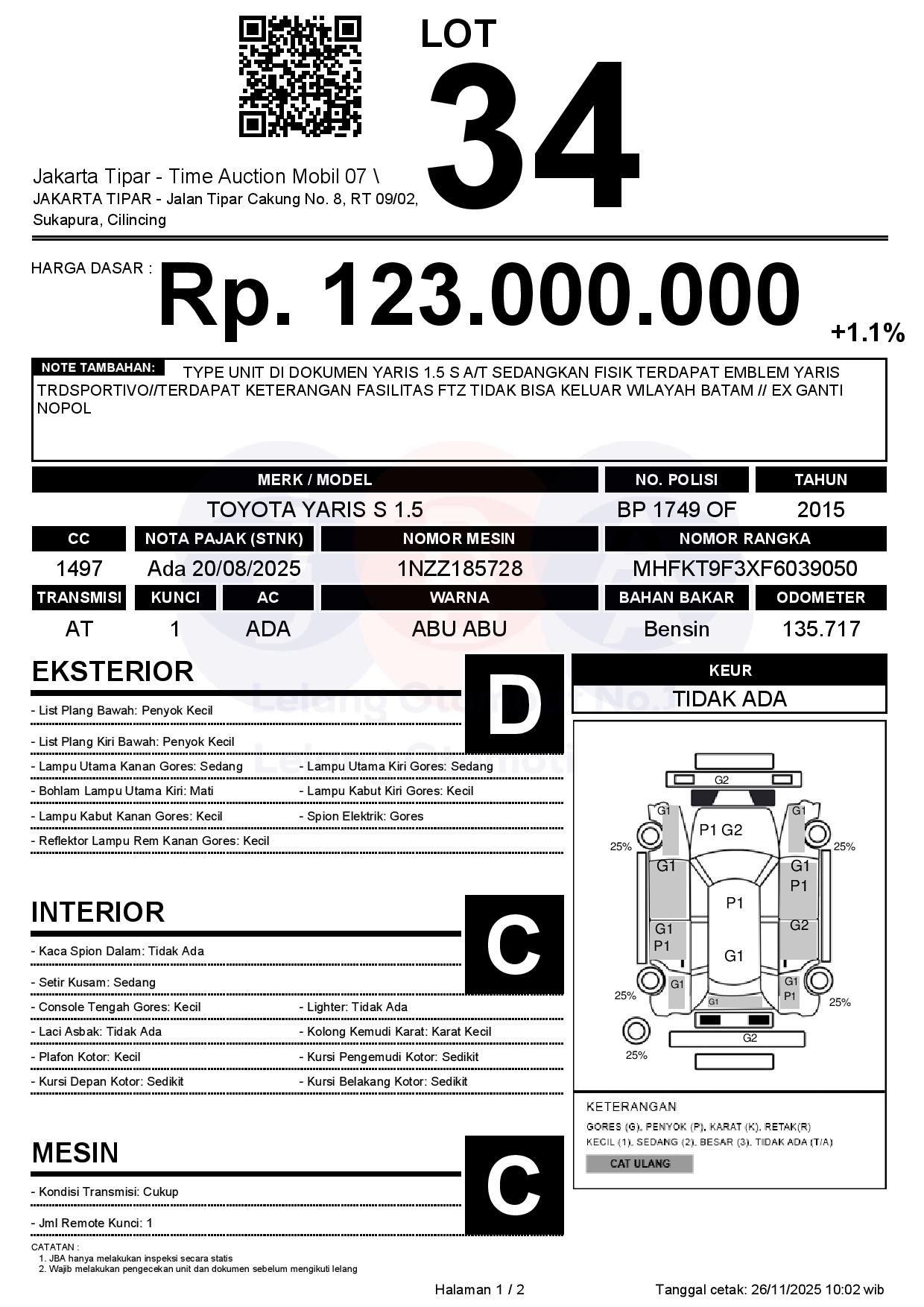 - Kondisi objek lelang dilelang apa adanya, baik kondisi fisik, mesin maupun legalitas kendaraan. Jika terdapat kekurangan/cacat baik yang terlihat maupun yang tidak terlihat, maka semua akan menjadi tanggung jawab/risiko Pemenang Lelang. Oleh karena itu, Pemenang Lelang melepaskan segala hak untuk menuntut dan/atau meminta ganti rugi atas hal tersebut kepada JBA.