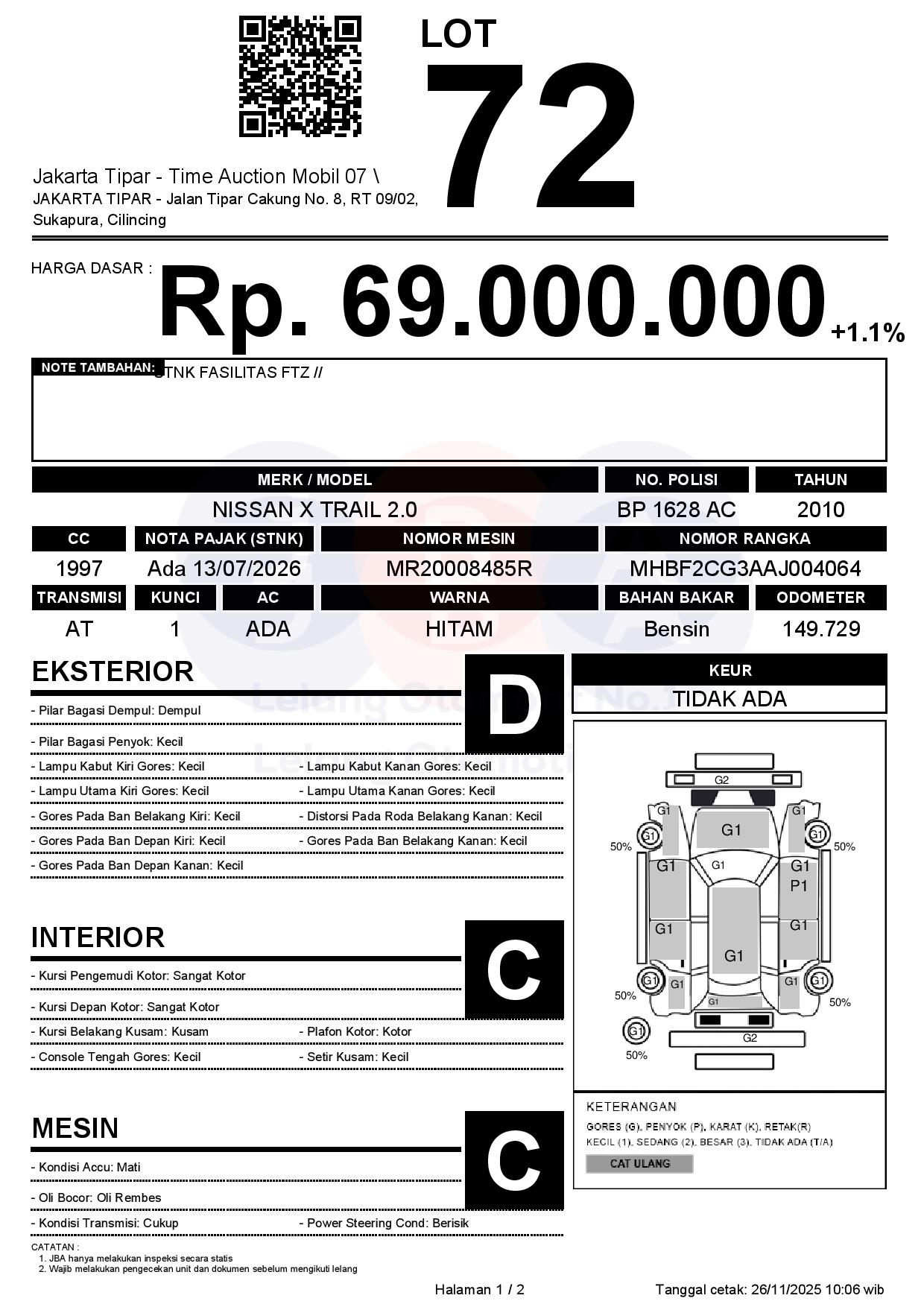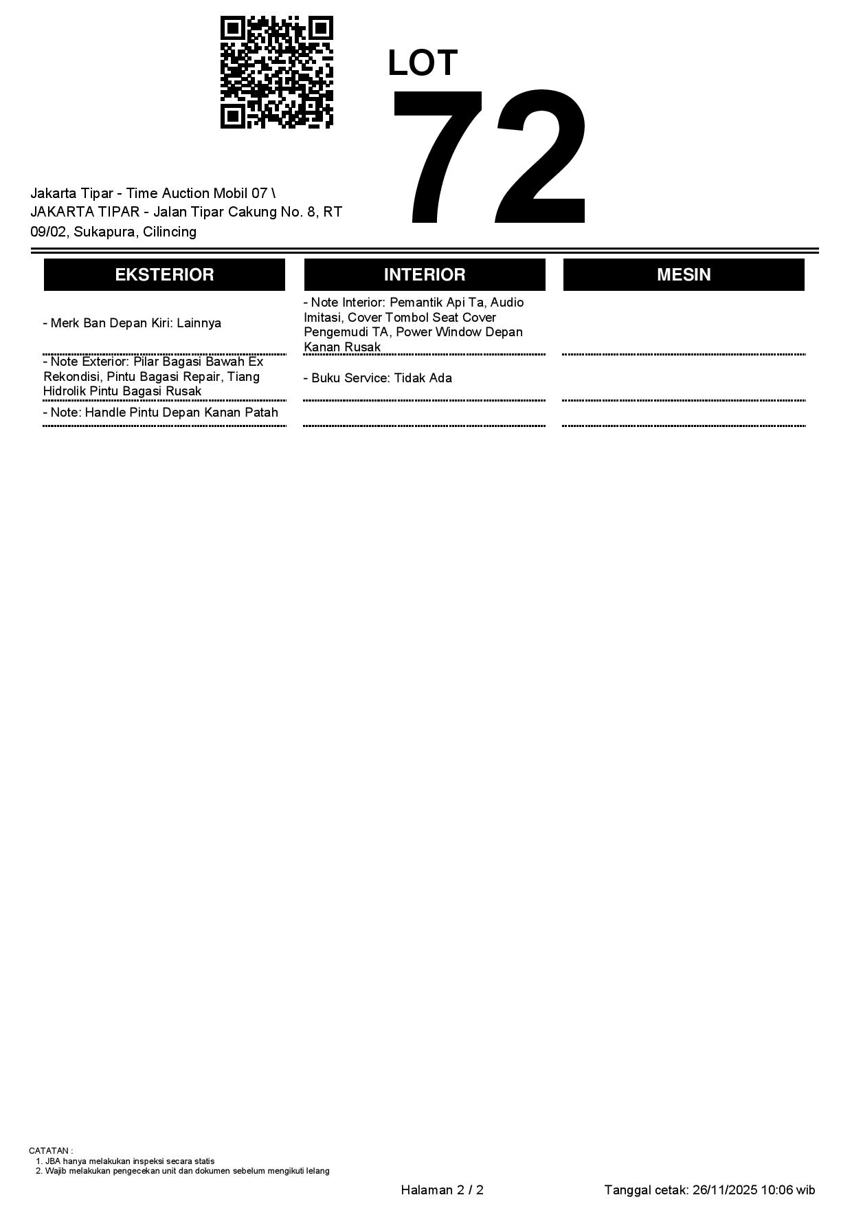 - Kondisi objek lelang dilelang apa adanya, baik kondisi fisik, mesin maupun legalitas kendaraan. Jika terdapat kekurangan/cacat baik yang terlihat maupun yang tidak terlihat, maka semua akan menjadi tanggung jawab/risiko Pemenang Lelang. Oleh karena itu, Pemenang Lelang melepaskan segala hak untuk menuntut dan/atau meminta ganti rugi atas hal tersebut kepada JBA.