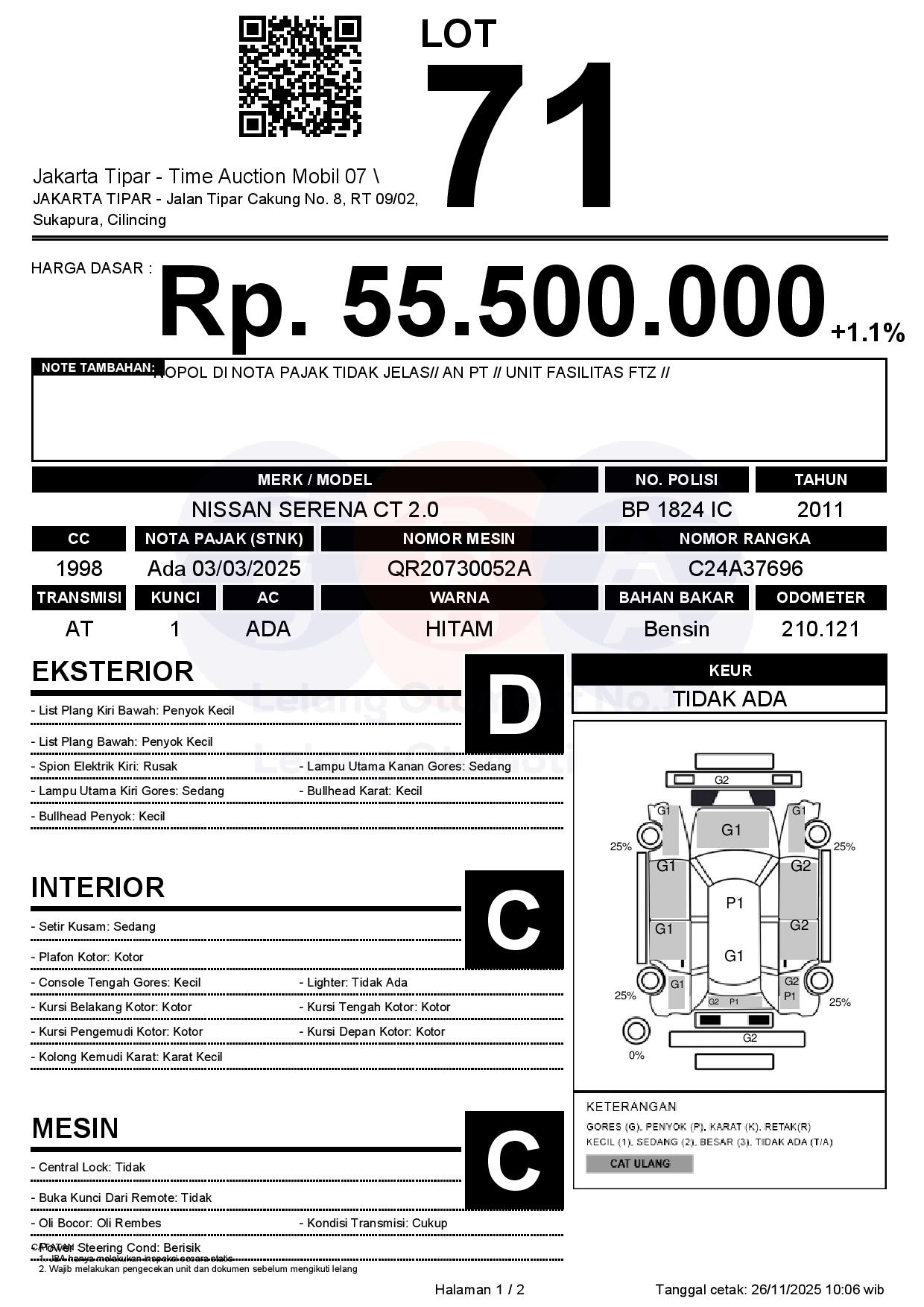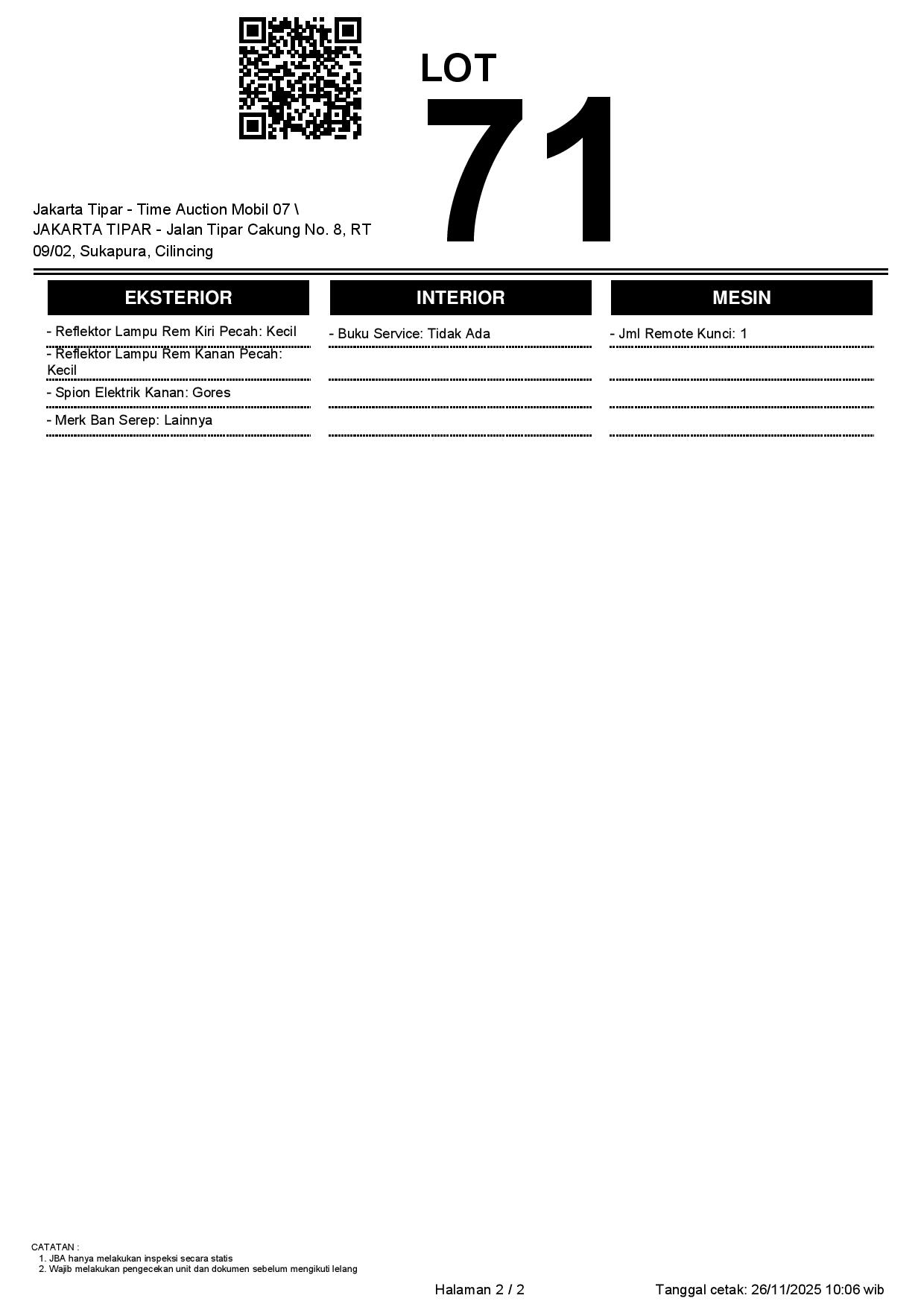 - Kondisi objek lelang dilelang apa adanya, baik kondisi fisik, mesin maupun legalitas kendaraan. Jika terdapat kekurangan/cacat baik yang terlihat maupun yang tidak terlihat, maka semua akan menjadi tanggung jawab/risiko Pemenang Lelang. Oleh karena itu, Pemenang Lelang melepaskan segala hak untuk menuntut dan/atau meminta ganti rugi atas hal tersebut kepada JBA.